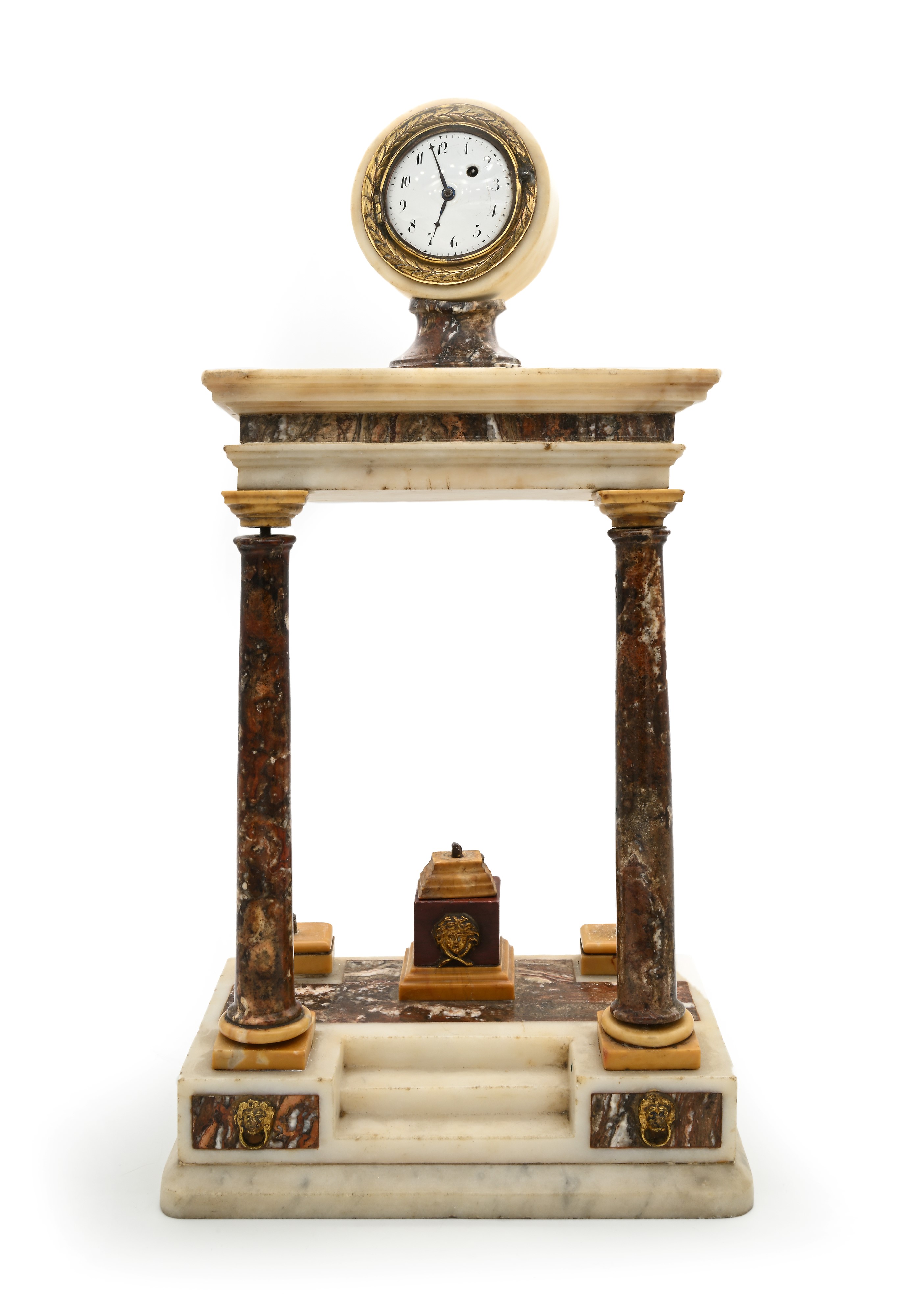 sormontato da un piccolo orologio con quadrante in smalto bianco a un unico foro di carica e indicazione oraria a numeri arabi. Difetti e mancanze