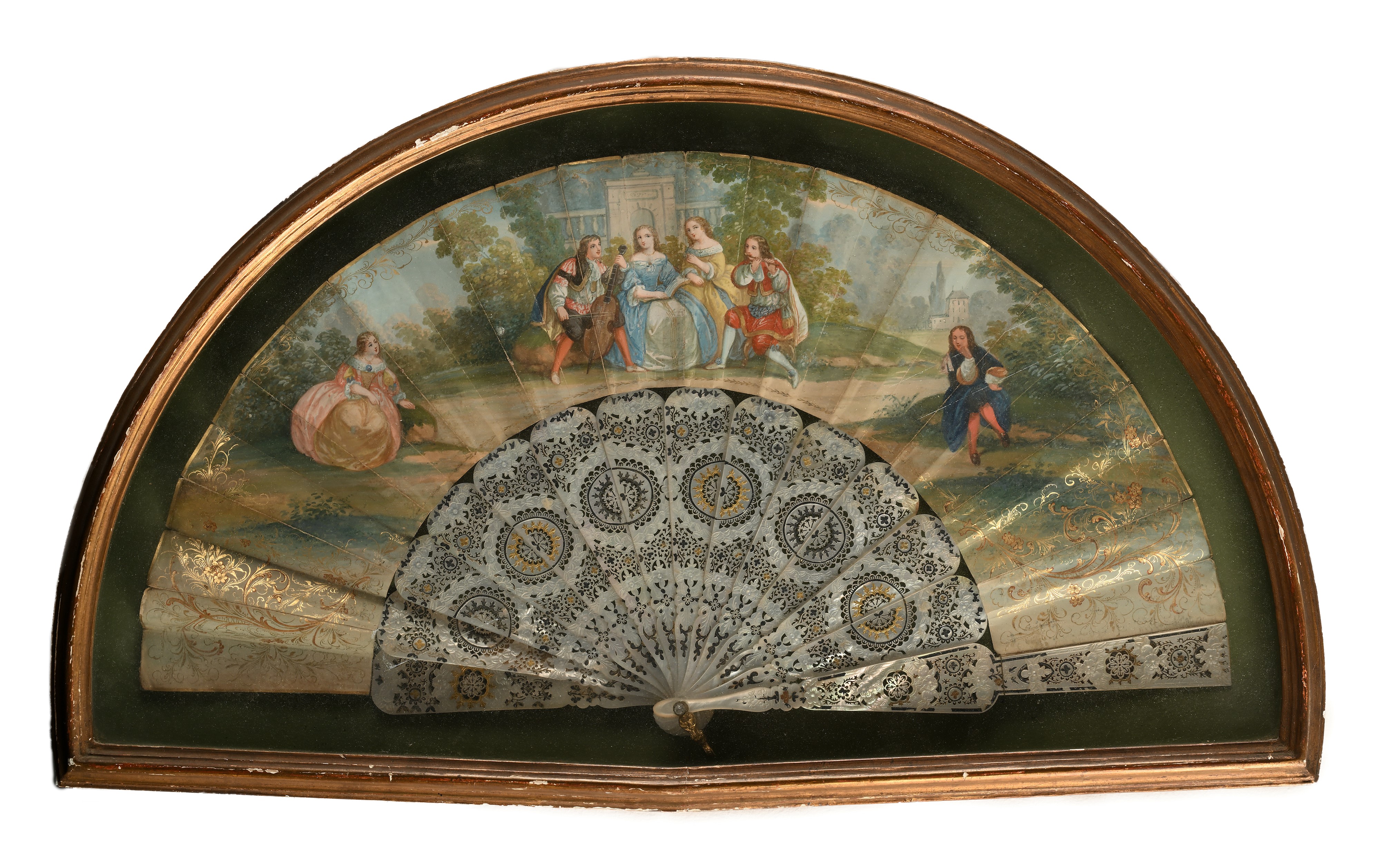 Ventaglio in cornice con stecche in madreperla e pagina con dame e musici, XIX secolo