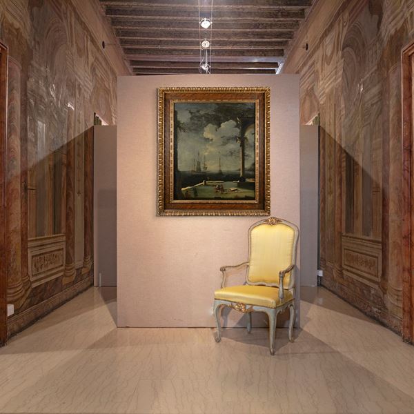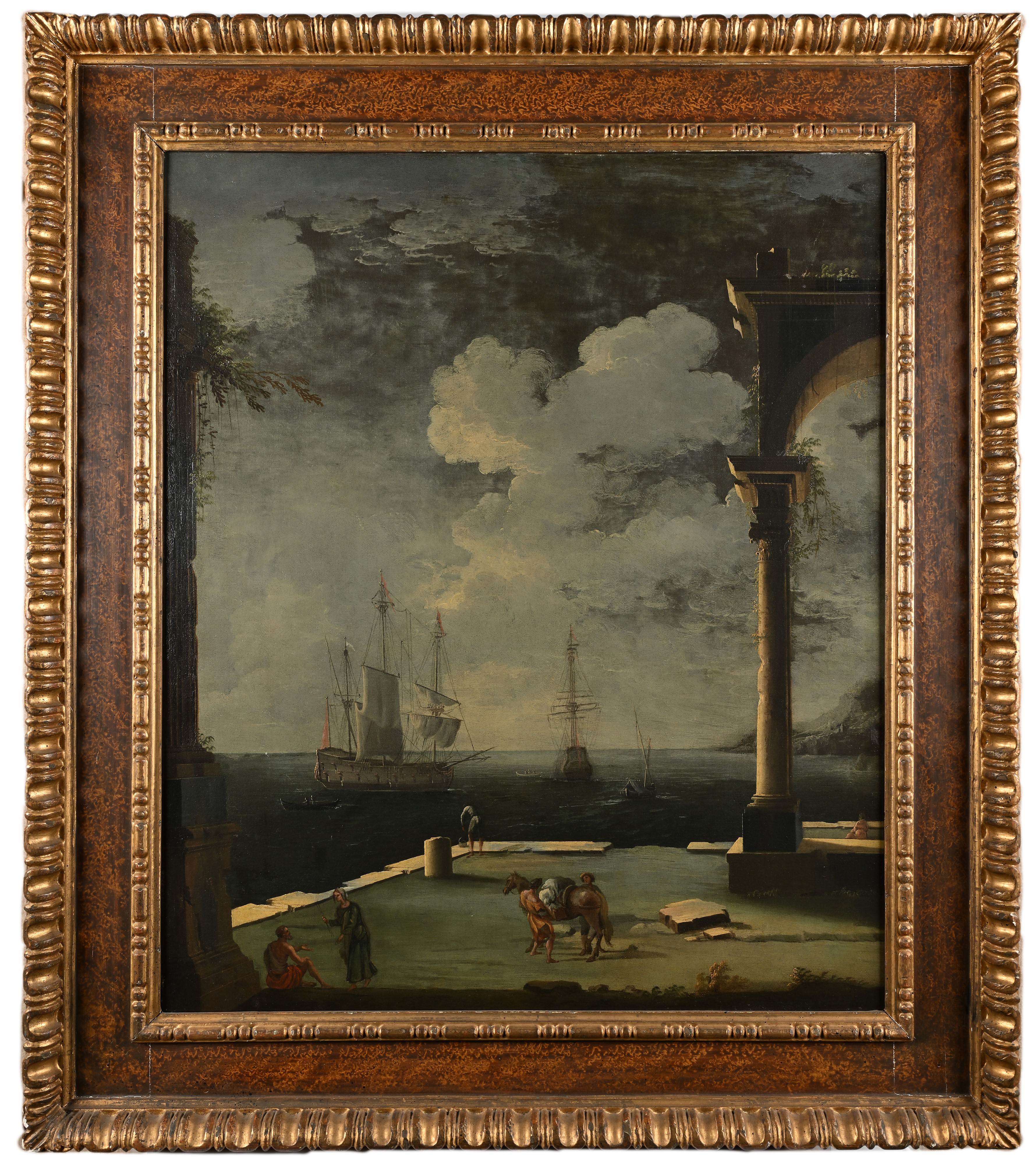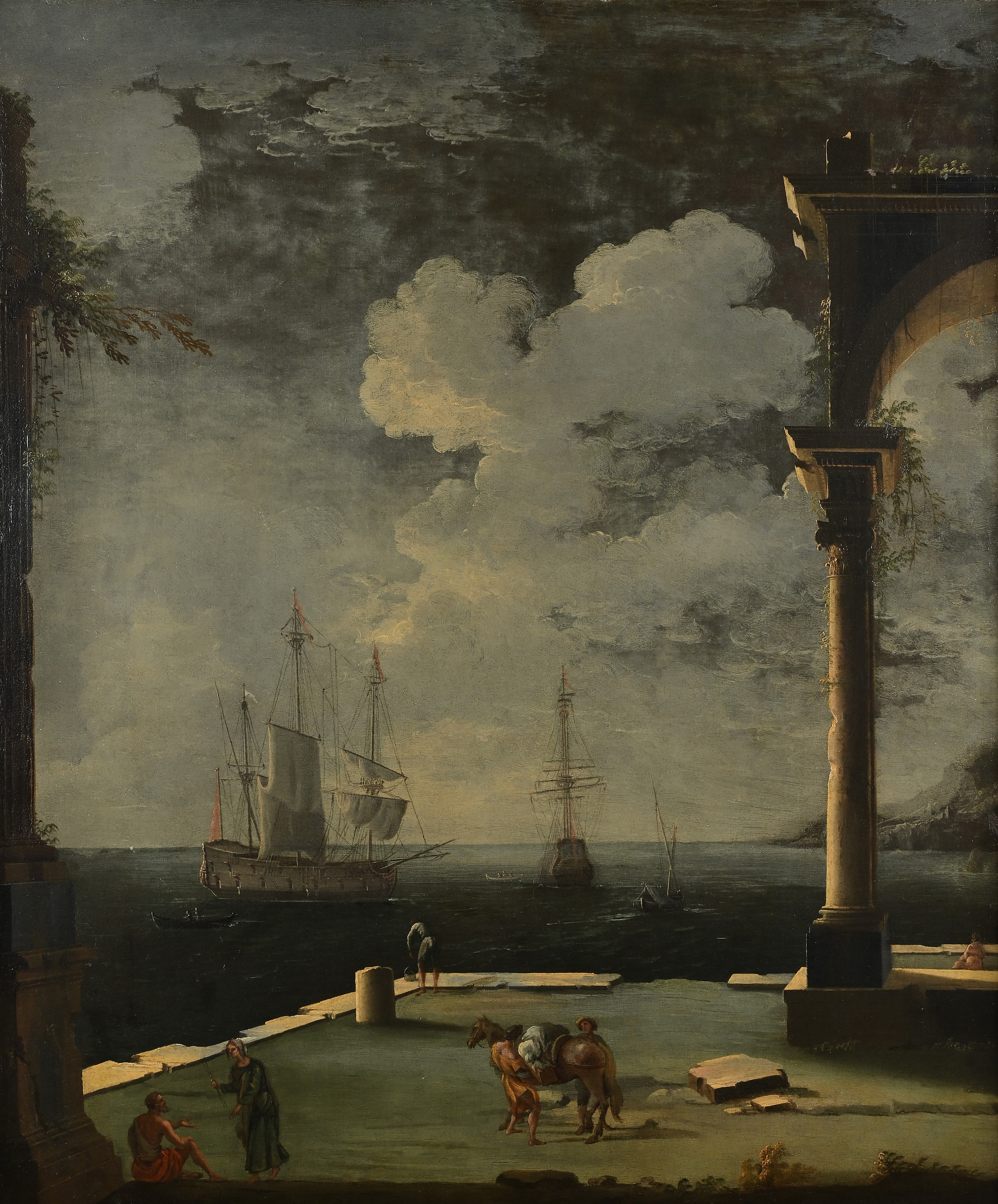 L’attribuzione dell’opera a Leonardo Coccorante è stata proposta dal professor Riccardo Lattuada. Nato a Napoli nel 1680, Coccorante si formò studiando inizialmente sotto la guida di Angelo Maria Costa. Fu proprio Costa a indirizzarlo verso la pittura di vedute dal taglio scenografico, un genere molto in voga all’epoca, caratterizzato da capricci architettonici animati da rovine classiche e piccole figure. Lo stile di Coccorante si distingue per la teatralità delle composizioni, l’uso sapiente della luce e l’attenzione al dettaglio architettonico, elementi che lo resero uno degli artisti più richiesti per questo tipo di rappresentazioni. La sua produzione, particolarmente apprezzata dai collezionisti del tempo, è oggi ben documentata e ampiamente rappresentata nelle raccolte pubbliche e private, soprattutto a Napoli, città nella quale operò per gran parte della sua carriera fino alla morte, avvenuta intorno al 1750.