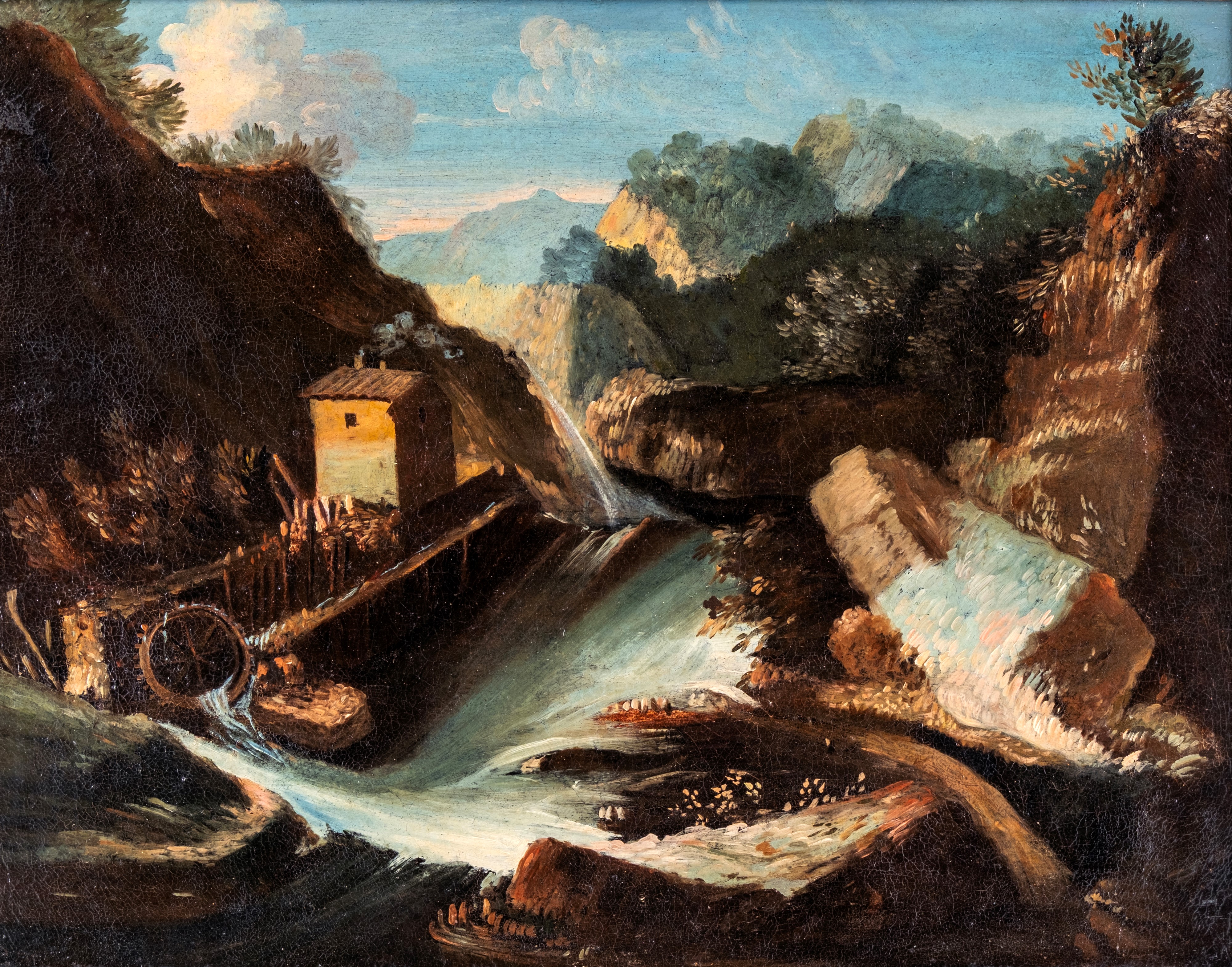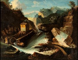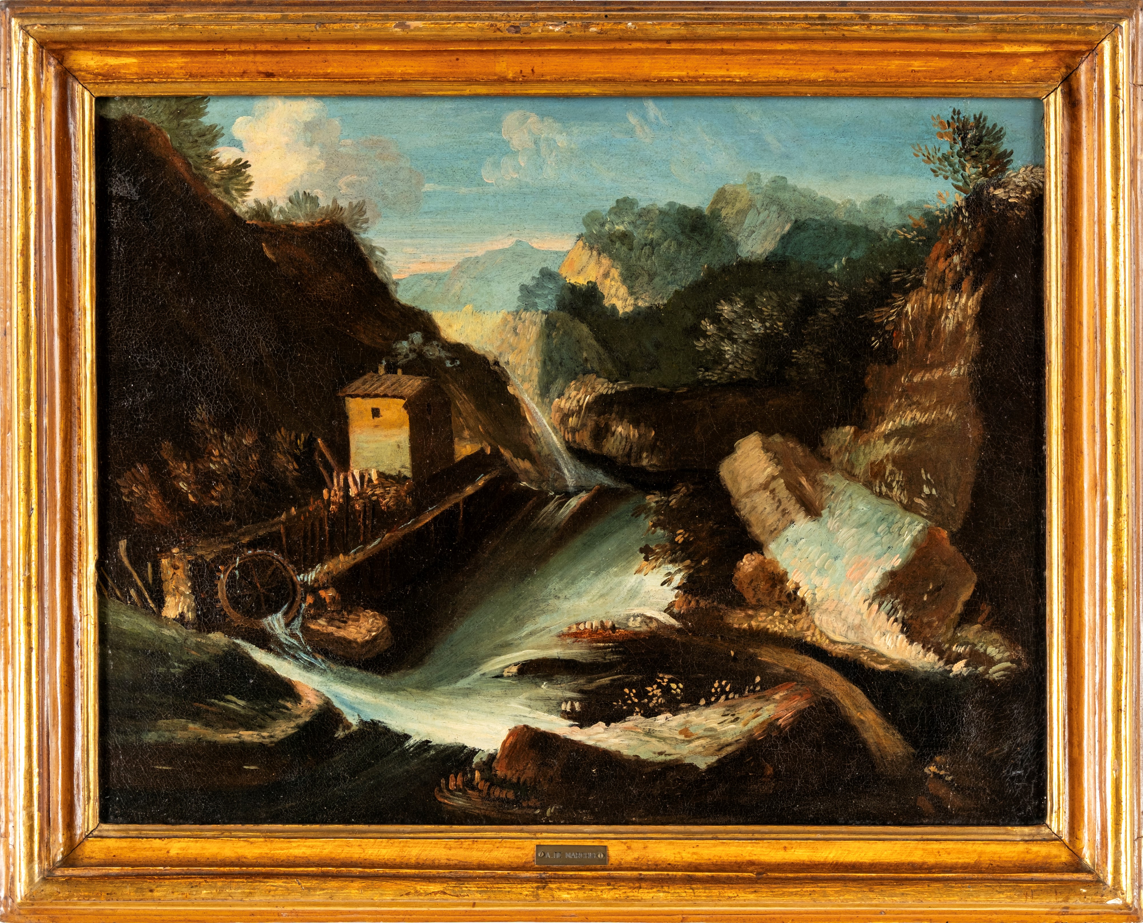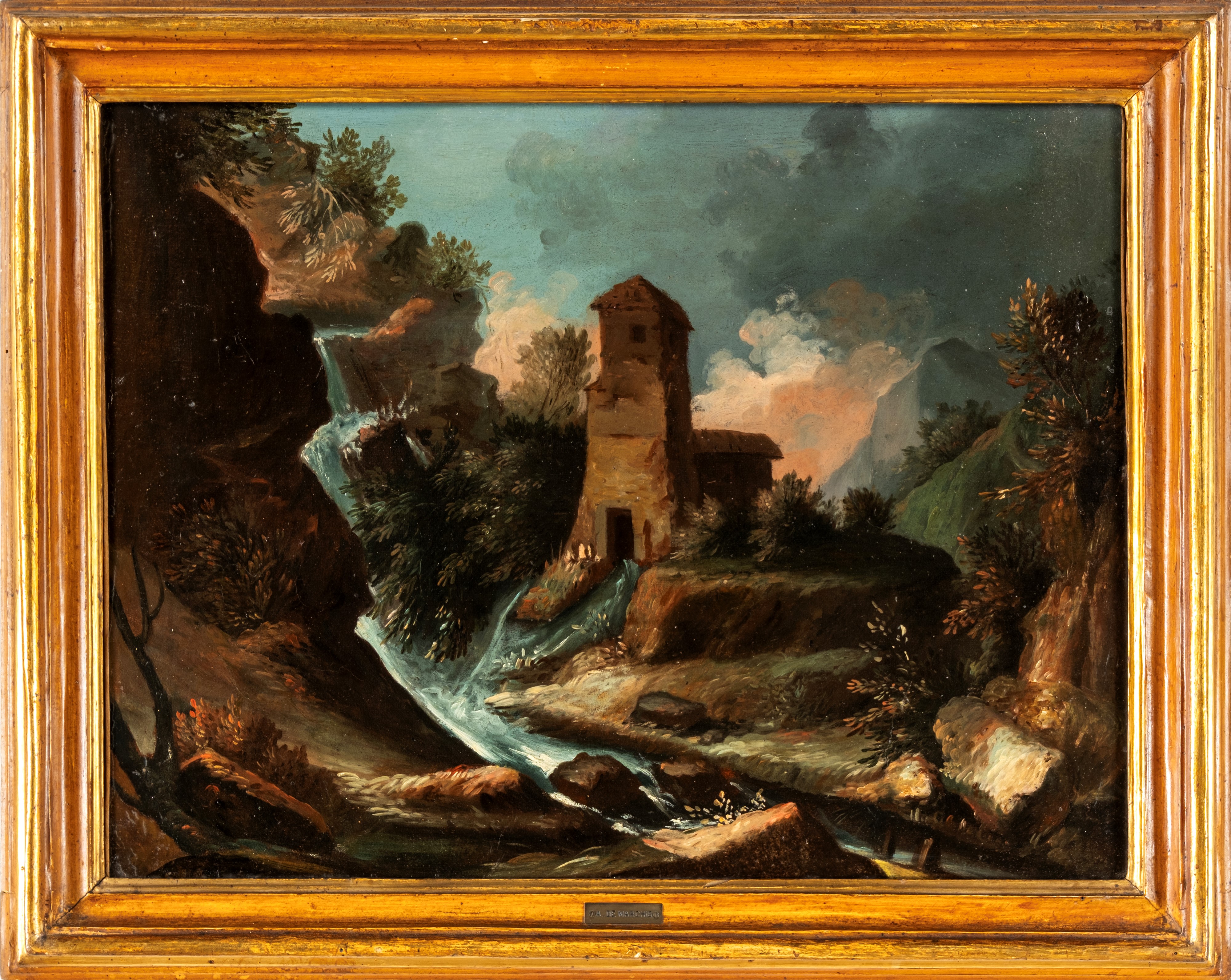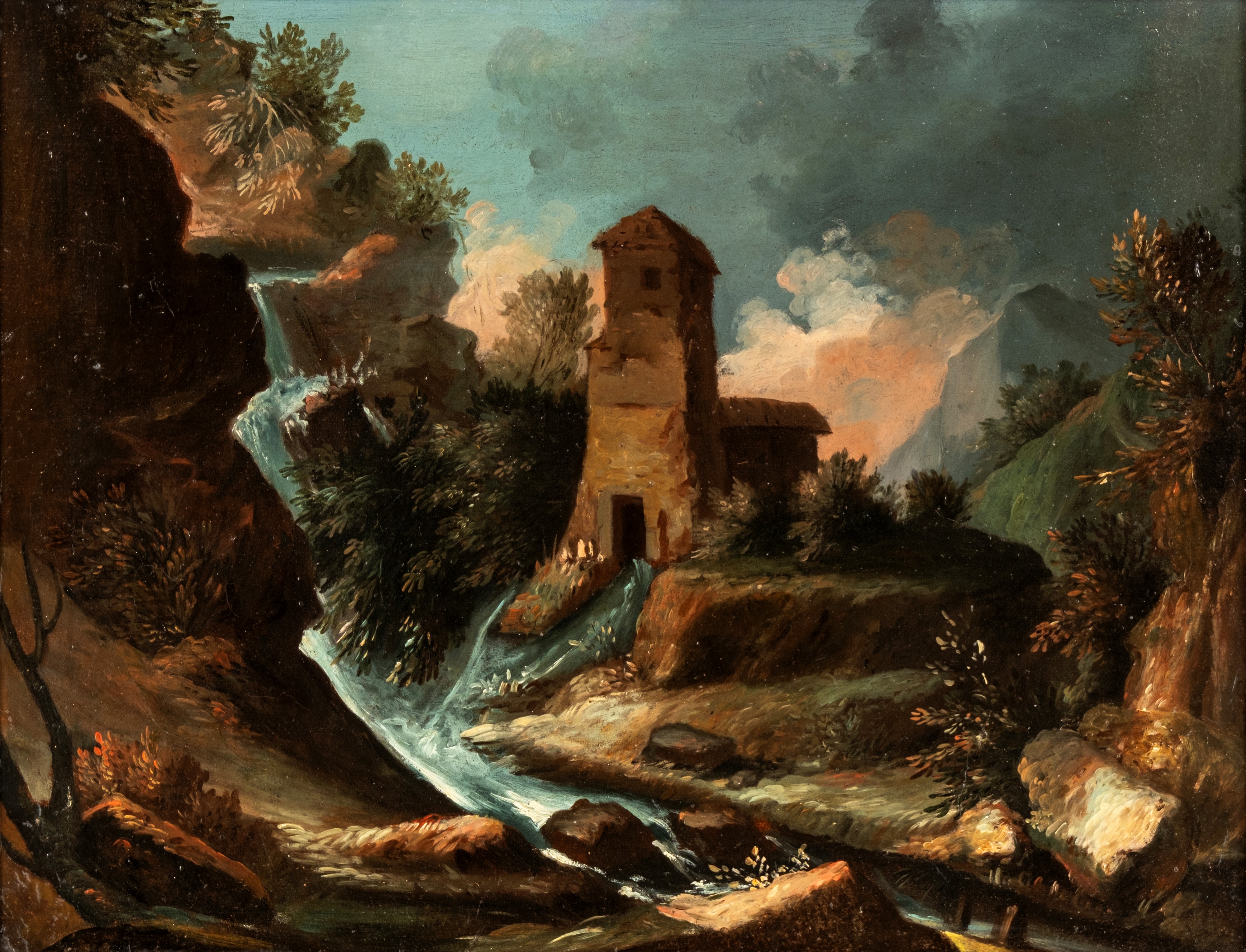 Coppia di dipinti: A) Paesaggio collinoso con casolare diroccato e torrente B) Paesaggio con rocce e mulino su un fiume