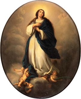 Vestita con una tunica bianca e un manto azzurro, coronata dai capelli ricci che cadono sulle sue spalle, la Vergine Maria è rappresentata a figura intera su uno sfondo luminoso di nuvole, con la luna, con le punte verso l'alto, sotto i suoi piedi, e sollevata da un gruppo di cherubini che spuntano da sotto il manto. Le mani, incrociate sul petto e lo sguardo rivolto verso l'alto, derivano dai modelli femminili di Guido Reni. Il dipinto si ricollega all'Immacolata Concezione di Anton Raphael Mengs, conservata nella Collezione Reale di Madrid, per la composizione equilibrata e simmetrica, il disegno molto nitido e una tavolozza composta da cromie vivaci.