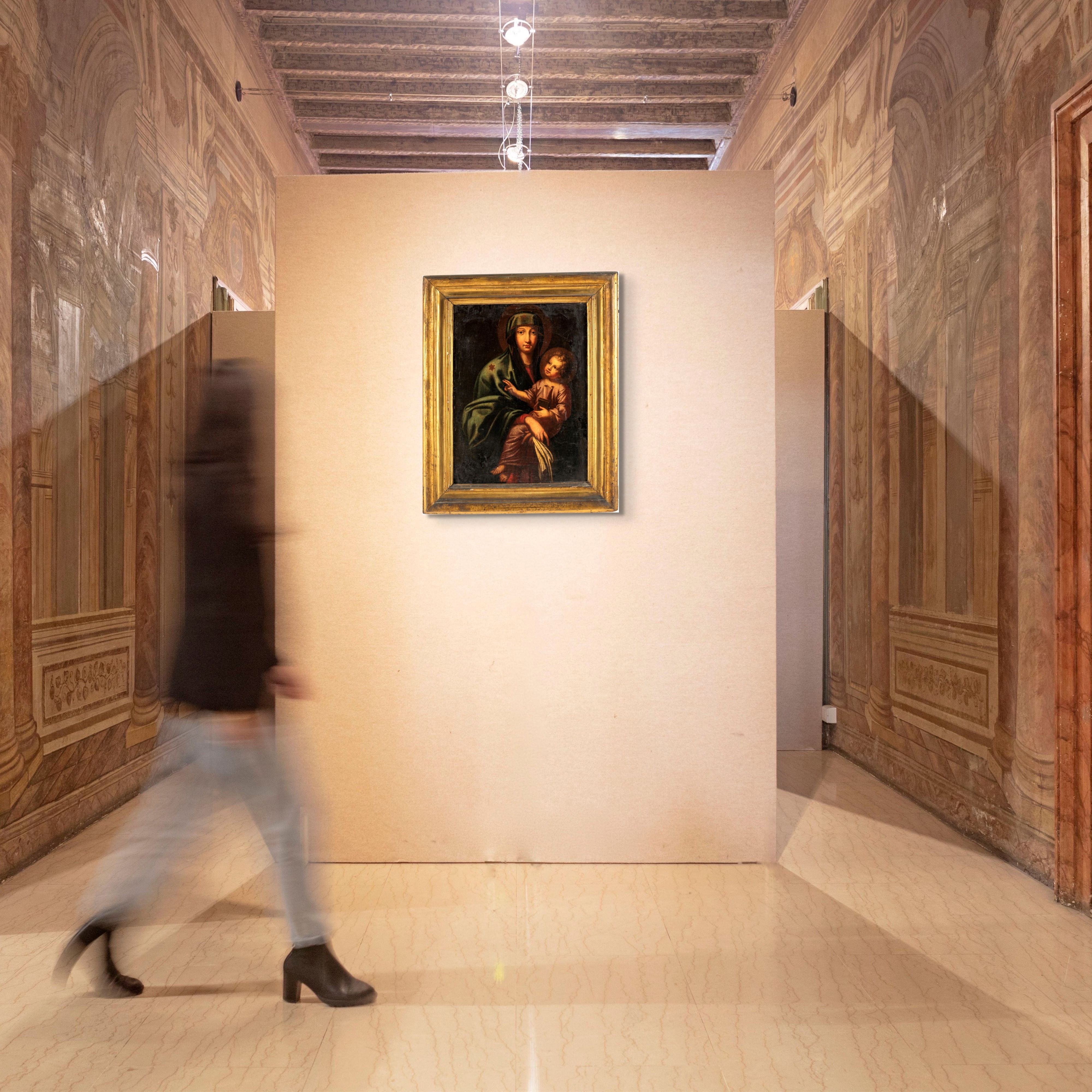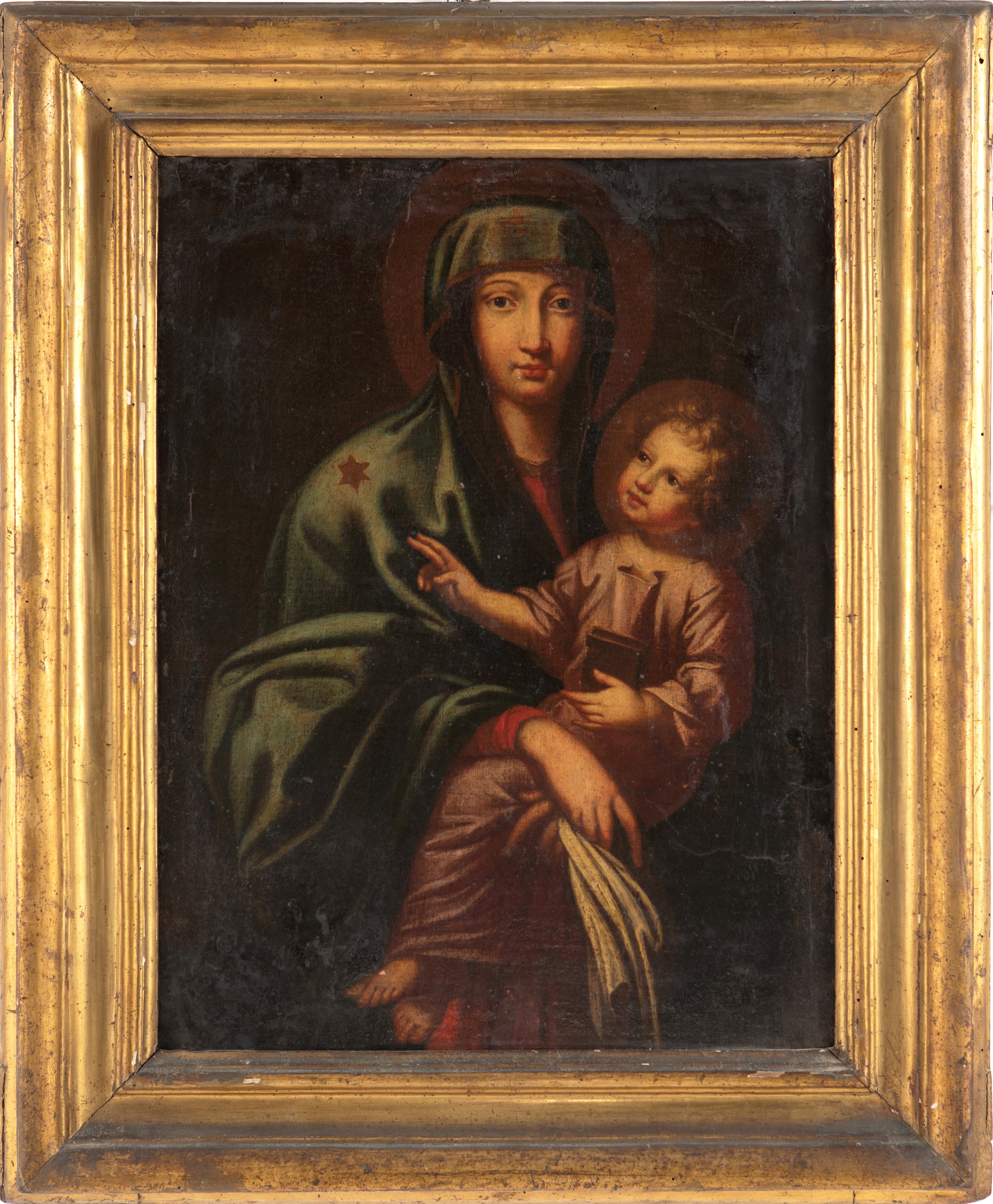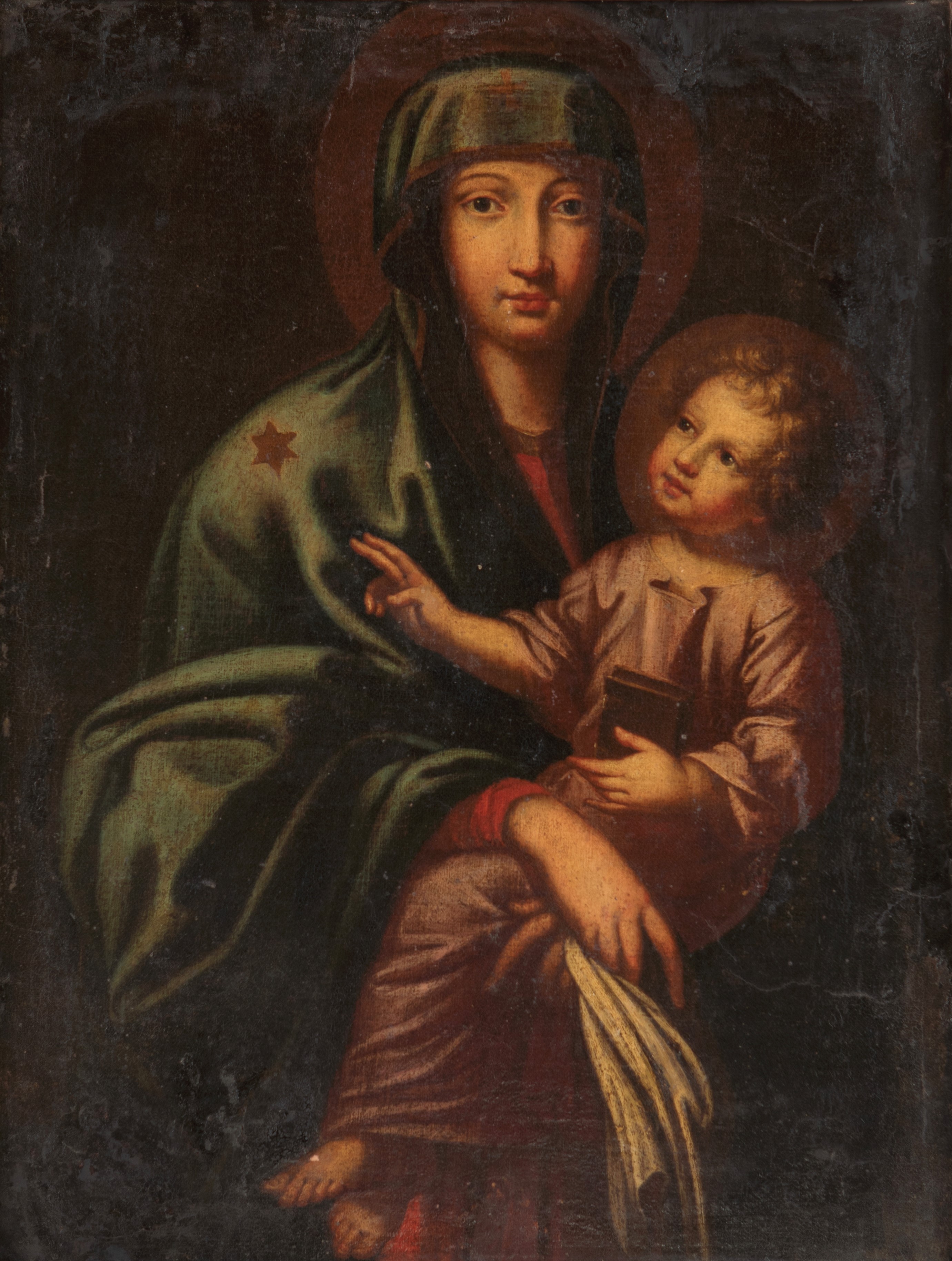 Il dipinto raffigura la Madonna con il capo coperto da un manto azzurro, sul quale spicca una stella che richiama l'iconografia della 'Salus Populi Romani', opera di ambito bizantino che, secondo la leggenda, sarebbe stata dipinta da San Luca e che è custodita nella Cappella Borghese di Santa Maria Maggiore a Roma. La Madonna sostiene una mappula, un fazzoletto cerimoniale simbolo imperiale che la rappresenta come Regina Coeli, e tiene in braccio il Bambino Gesù, che regge un libro nella mano sinistra, probabilmente un evangeliario. Interessante è la gestualità delle mani: con la destra, il Bambino compie un gesto di benedizione con due dita rivolte verso l'alto, l'indice e il medio, e piegando le altre dita sul palmo, mentre la Vergine ha l'indice esteso. Le tre dita tra Madre e Figlio simboleggiano la Trinità: il Padre, il Figlio e lo Spirito Santo.