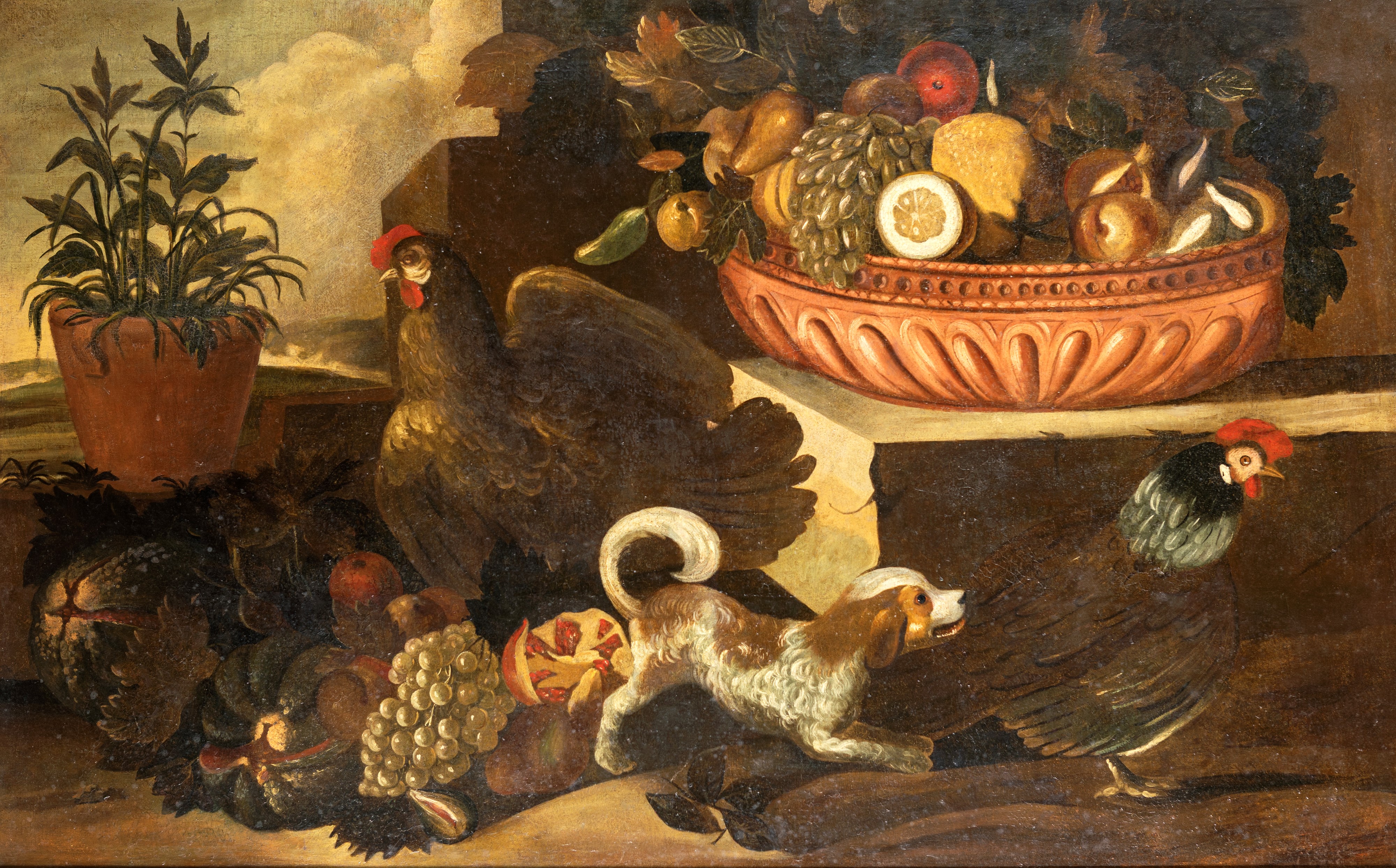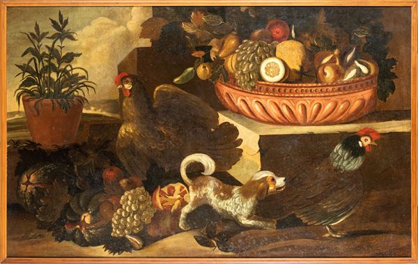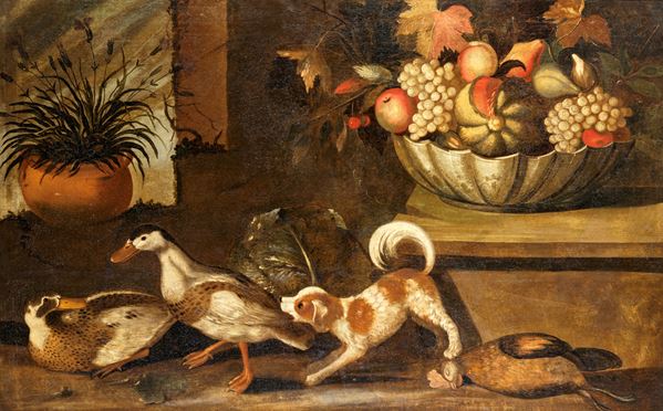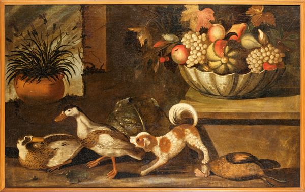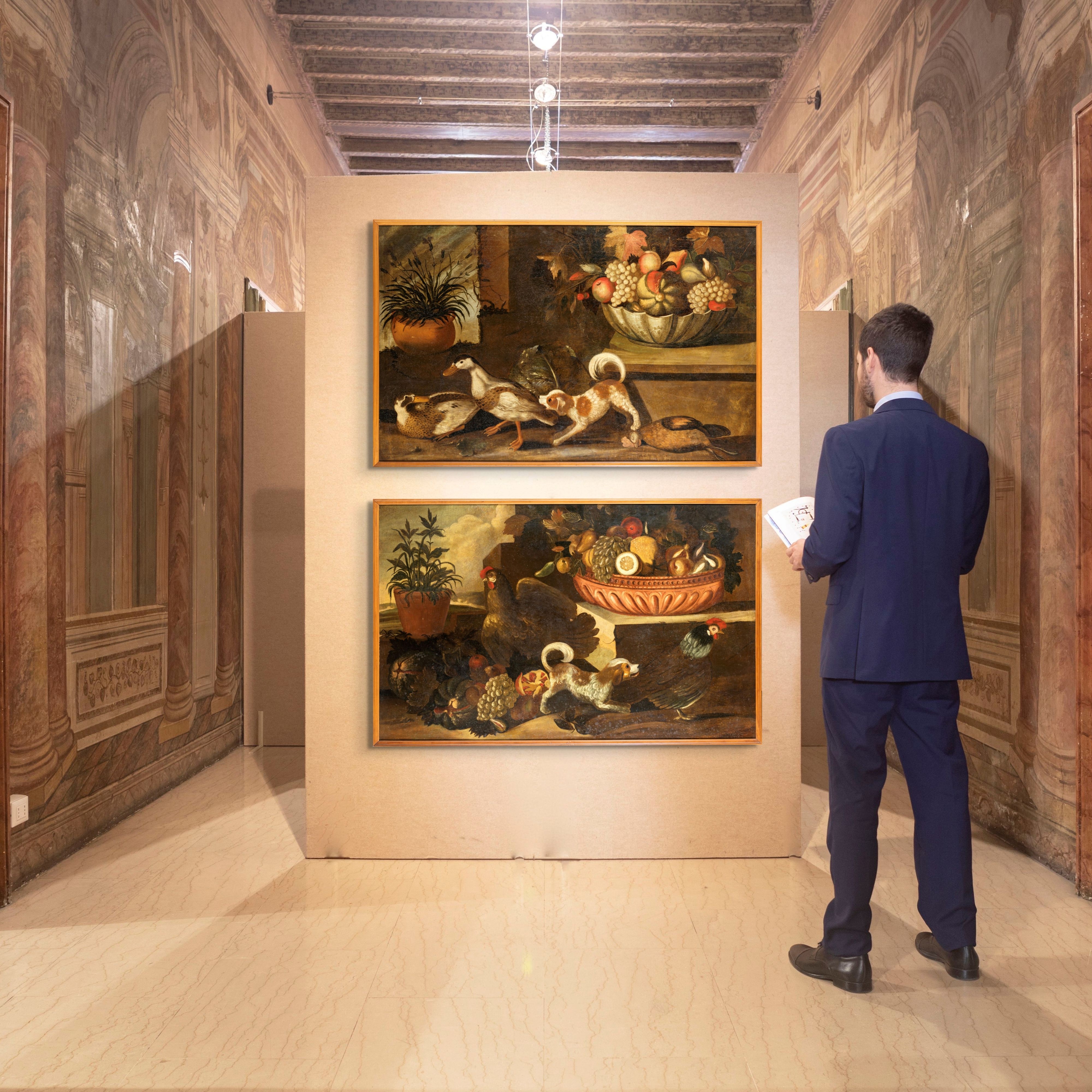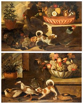 Coppia di dipinti: Natura morta con animali e frutta