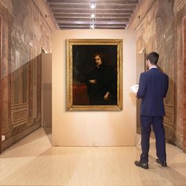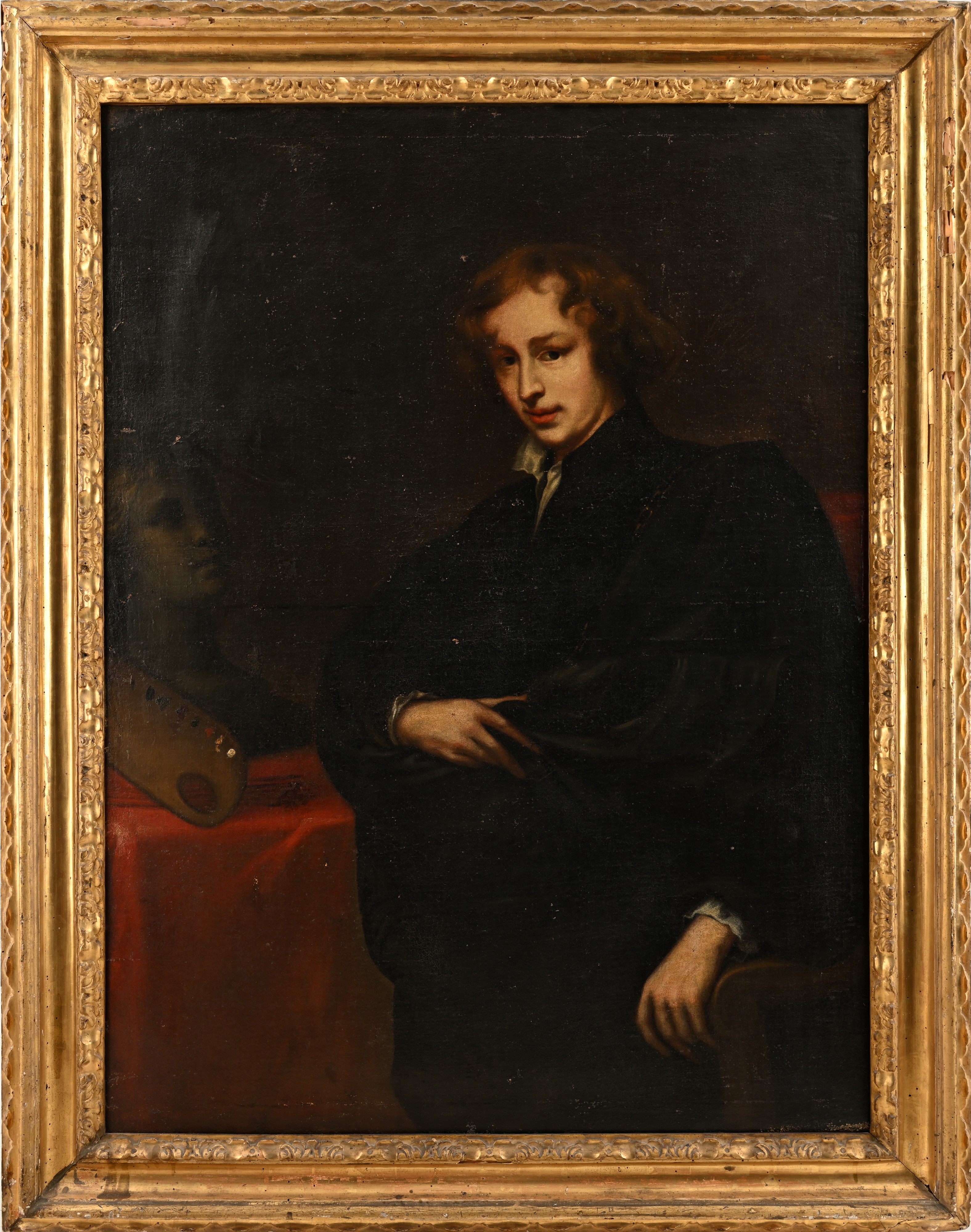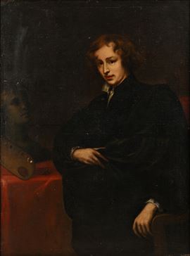 Antoon Van Dyck realizza tre autoritratti intorno al 1620, in cui si raffigura come un giovane aristocratico, avvolto in mantello di velluto nero. Questi dipinti sono oggi conservati al Metropolitan Museum di New York, all’Ermitage di San Pietroburgo e alla Alte Pinakothek di Monaco. Il dipinto qui presentato, eseguito probabilmente nel corso del Settecento, riprende fedelmente questa iconografia, raffigurando ancora una volta il giovane Van Dyck in una posa analoga, con lo sguardo magnetico rivolto verso lo spettatore. La composizione si arricchisce inoltre con l'inserimento di una tavolozza d’artista e di una scultura antica sul lato sinistro.