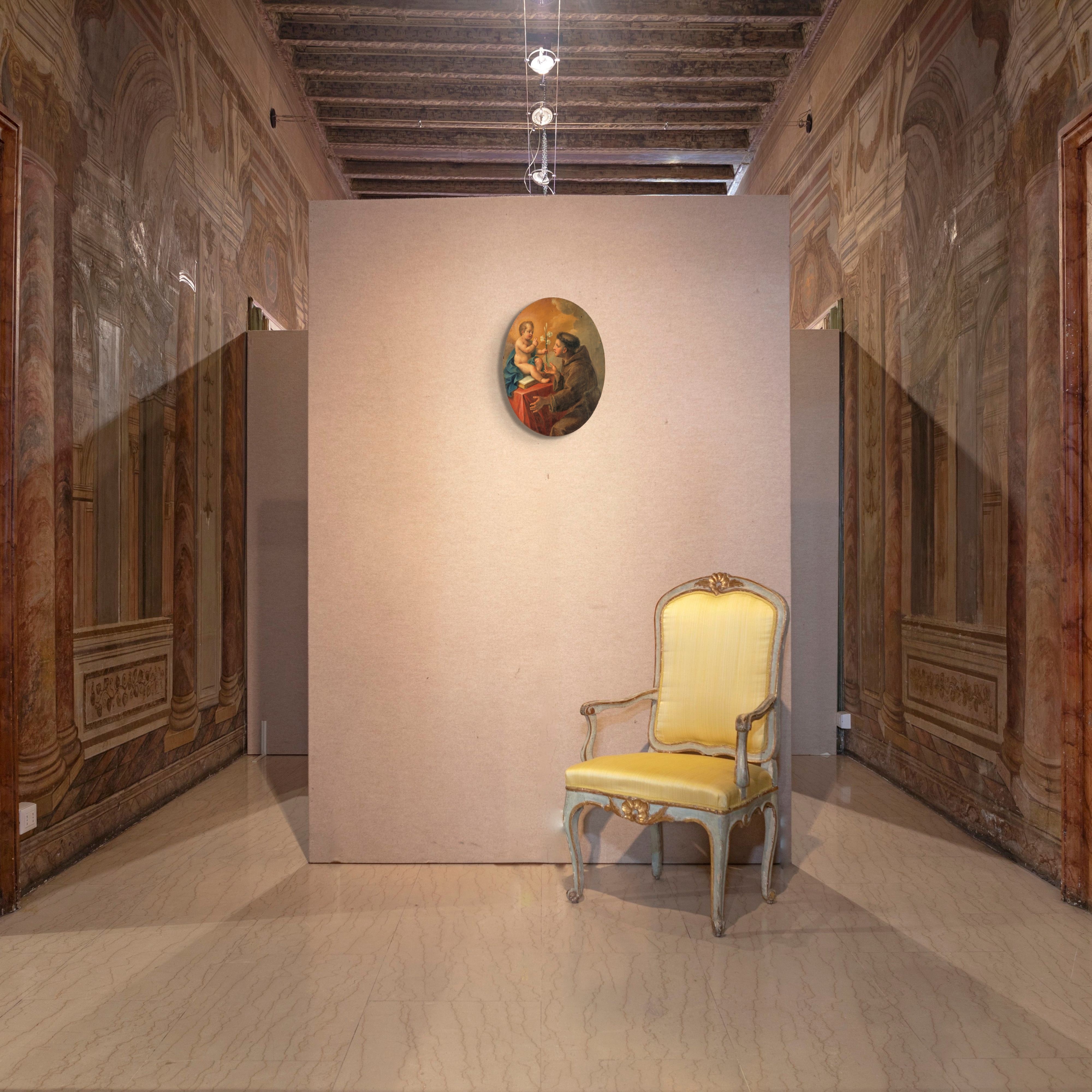 Il dipinto raffigura Sant'Antonio in adorazione del Bambino Gesù, che è seduto su un libro, mentre tiene un giglio in mano. Il libro simboleggia la profonda conoscenza delle Scritture del santo, mentre il giglio rappresenta la sua purezza. La scena trasmette un senso di devozione e spiritualità, mettendo in evidenza i valori religiosi che caratterizzano la figura di Sant'Antonio da Padova.