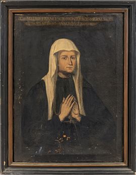 L'identità del personaggio raffigurato è attestata dall'iscrizione presente in alto sulla tela: 'LA MADRE FRANCESCA MONTIOUX FRANCESA - ÆTATIS 50 - ANNO 1628'. Si tratta del ritratto di Madre Francesca Montioux all'età di 50 anni.