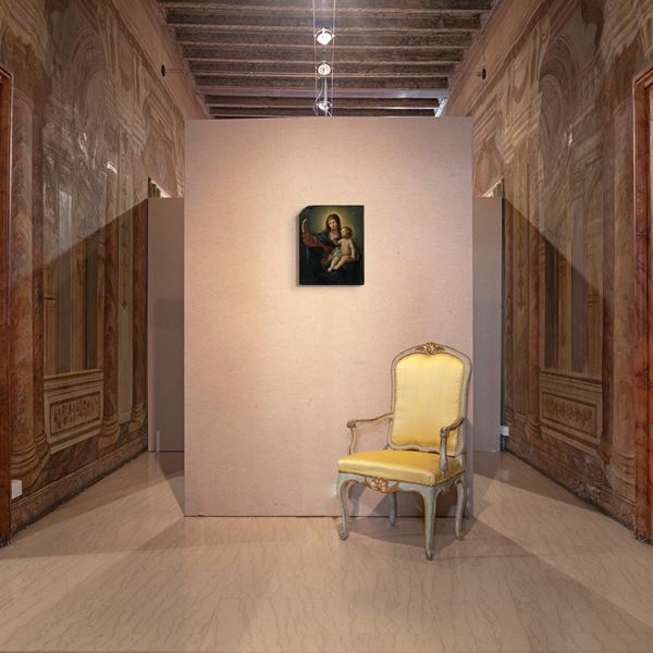 Quest'opera, realizzata su lavagna, raffigura la Madonna che, con il Bambino nel braccio sinistro, regge con la mano destra il Santo Rosario, al quale il Bambino rivolge lo sguardo. Entrambi i personaggi sono avvolti da una luce che accentua la loro sacralità, creando un'atmosfera di serenità e devozione. Il dipinto richiama un'opera attribuita a Guido Reni, conservata nella collezione del Museo d'Arte di Simferopol, Ucraina.