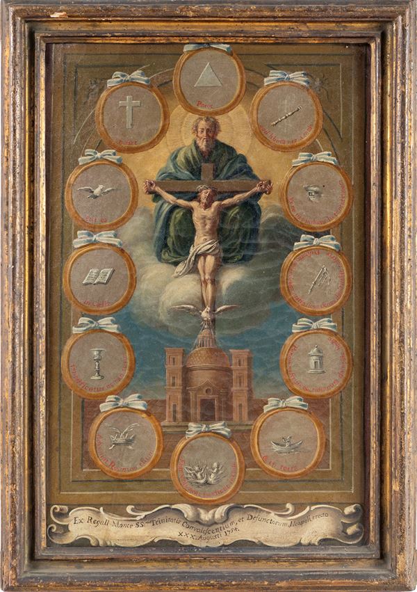 Scritta in basso "Ex Regali Monte SS. Trinitatis Convalescentium, et Defunctorum Neapoli erecto XXX. Augusti 1784"