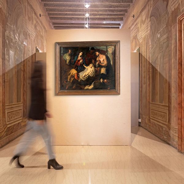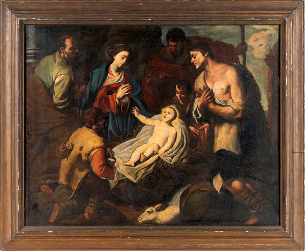 Al centro della scena spicca la figura della Vergine Maria, colta in un gesto di silenziosa venerazione verso il Bambino Gesù, adagiato su un lenzuolo bianco nella mangiatoia. Entrambe le figure sono avvolte da una luce intensa che le isola e le esalta, rendendole il fulcro emotivo e visivo della composizione. Accanto a loro, San Giuseppe osserva assorto e pensoso, mentre attorno si raccolgono i pastori, umili testimoni del miracolo e primi adoratori del Salvatore, nonostante la loro appartenenza agli strati più bassi della società. Sul fondo si intravedono elementi di architettura classica che conferiscono profondità e solennità all’ambientazione.