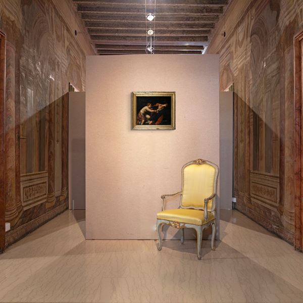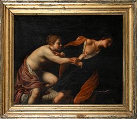 Il dipinto raffigura la moglie di Putifarre nel momento in cui trattiene per la veste lo schiavo Giuseppe, in un disperato tentativo di sedurlo trascinandolo verso il proprio letto. Il soggetto è tratto dall'Antico Testamento (Gen 39,7-20). Giuseppe, figlio di Giacobbe, dopo essere stato venduto dai fratelli, divenne schiavo al servizio di Putifarre, consigliere del faraone in Egitto. La moglie di Putifarre si innamorò di Giuseppe e cercò di sedurlo, ma lui la respinse. Invece di accettare il rifiuto, lei calunniò Giuseppe, accusandolo di attentare al suo onore e facendolo imprigionare. Esiste un’opera analoga, registrata negli archivi F. Zeri (c.i. F1768) e conservata in collezione privata, raffigurante lo stesso soggetto e di dimensioni simili. Secondo una perizia di Federico Zeri, l’opera è attribuibile ad Alessandro Turchi, detto l’Orbetto, e può essere riferita alla sua fase matura, successiva al trasferimento a Roma. Zeri osserva come l’artista abbia realizzato ulteriori versioni del medesimo soggetto, su supporto in lavagna, sebbene nessuna di queste raggiunga la qualità dell’opera in questione.