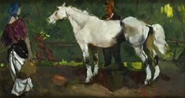 Coppia di contadini in sosta con un cavallo bianco , 1946