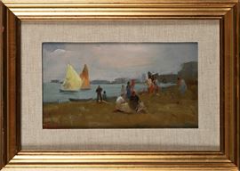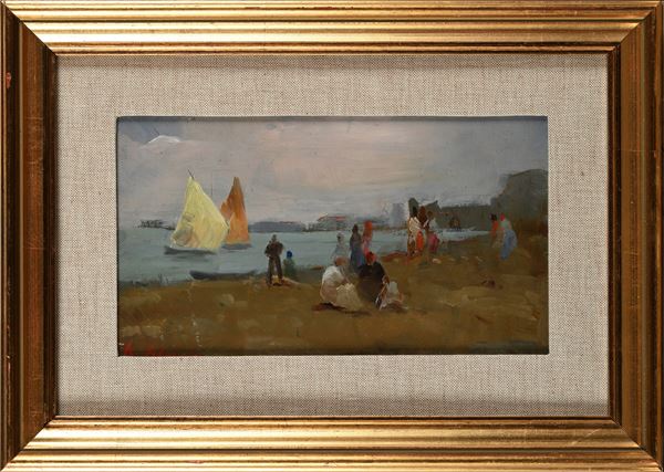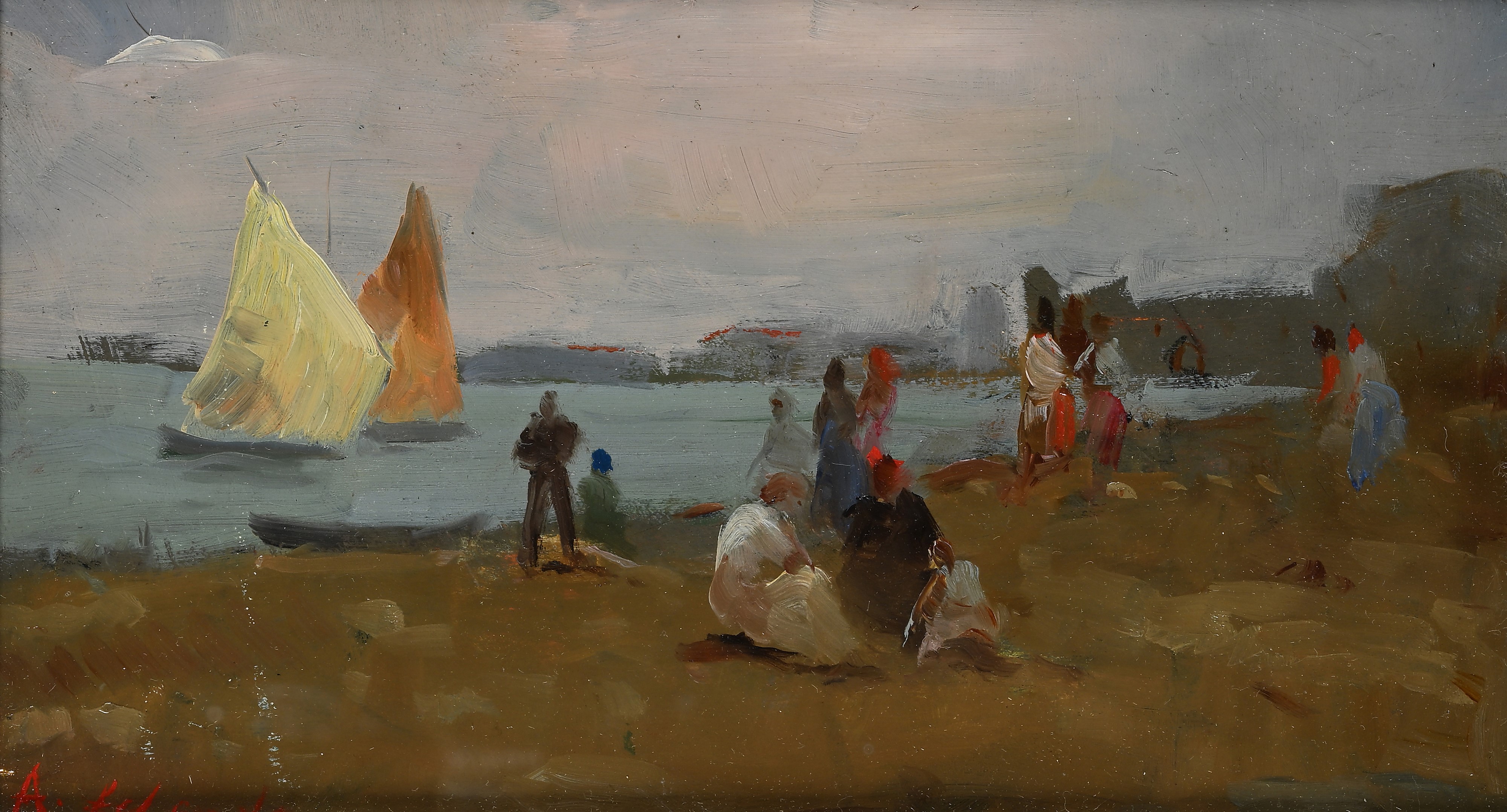 Spiaggia di una città costiera con figure e vele in mare.