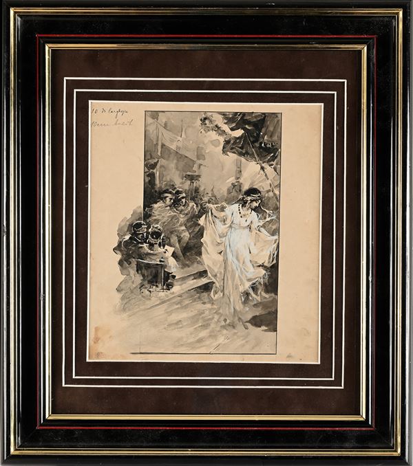 Si tratta di una tavola per la versione illustrata italiana della ‘Salomè’ di Oscar Wilde, edita dalla Libreria Editrice Bideri di Napoli nel 1907.