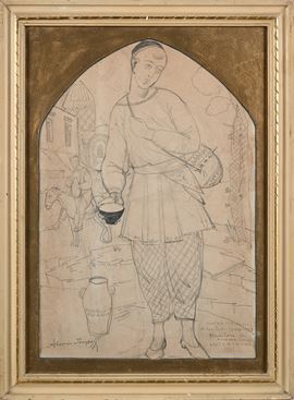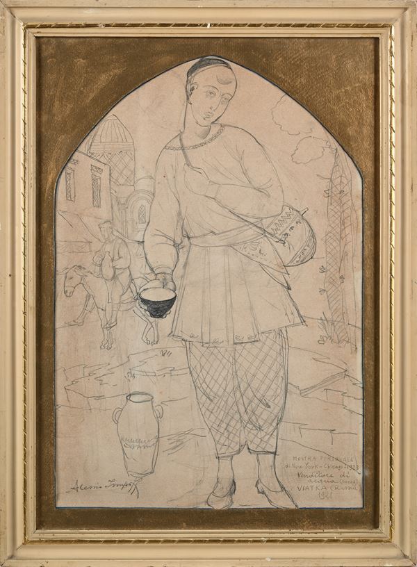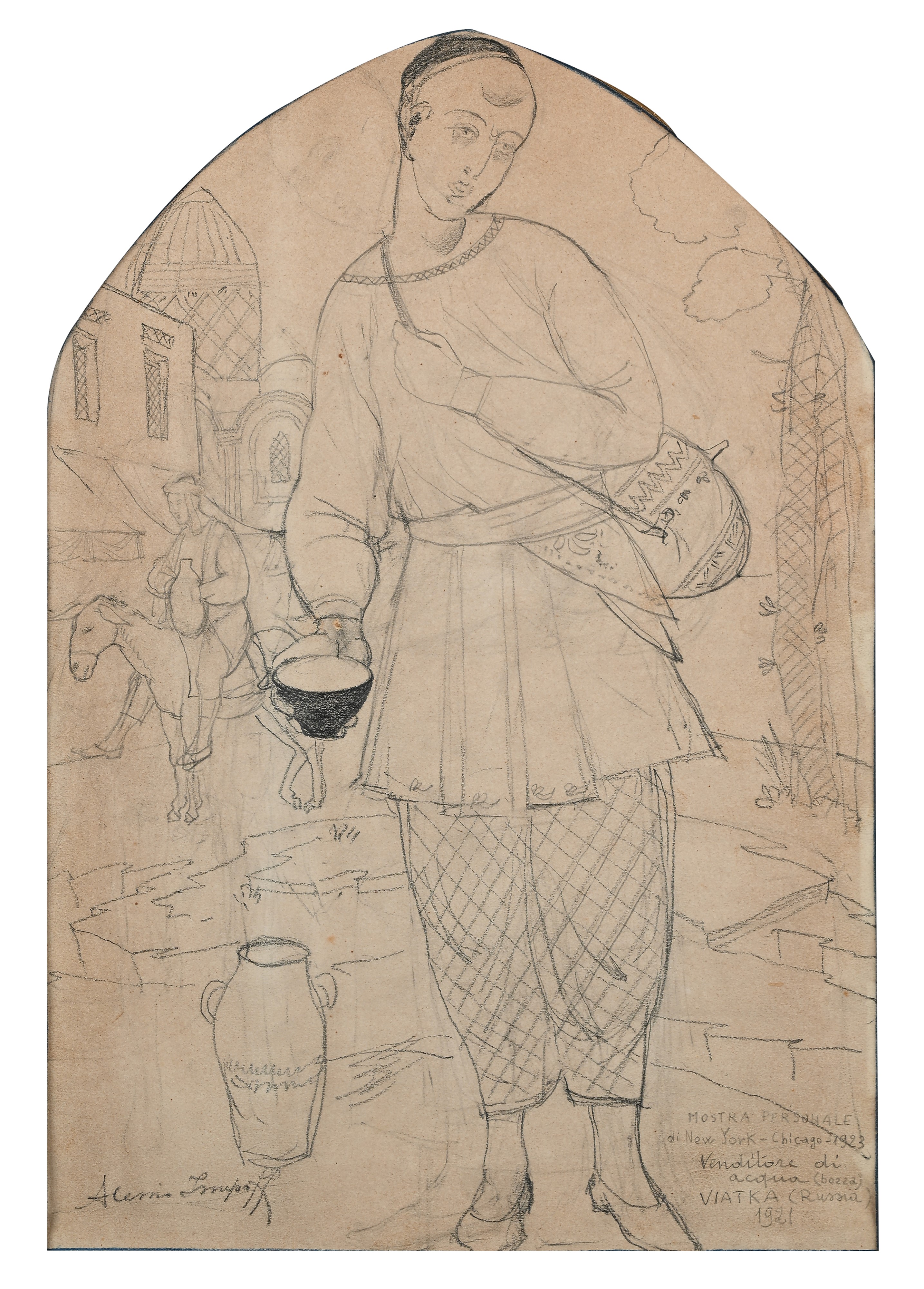 Firmato: 'Alessio Issupoff' in basso a sinistra e intitolato: 'MOSTRA PERSONALE / di New York - Chicago - 1923 / Venditore di acqua (bozza) / VIATKA (Russia) / 1921'.