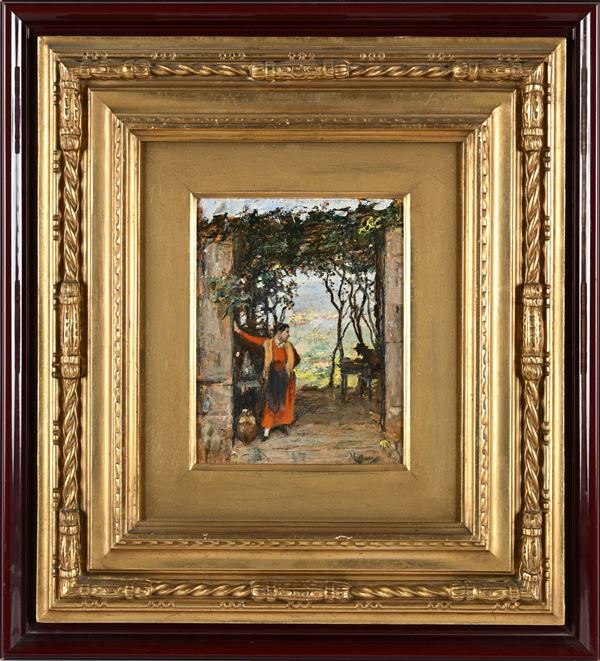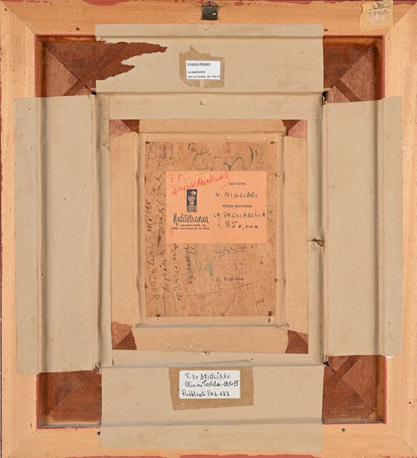 Sul retro antica dichiarazione di autenticità in parte coperta da cartellino a stampa della galleria d'arte 'Mediterranea' di Napoli con scritto autore, titolo e prezzo dell'opera (Lire 850.000).