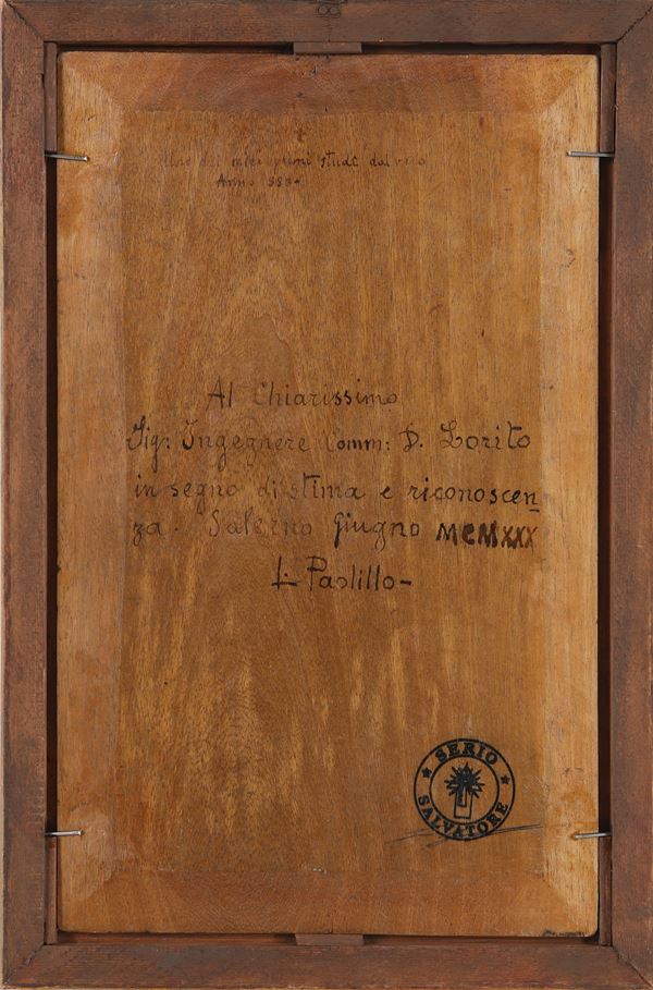 Sul retro: scritta dell'artista: 'Uno dei miei primi studi dal vero / Anno 1883; dedica e firma di mano dell'artista in data 1930; timbro e firma di Salvatore Serio.