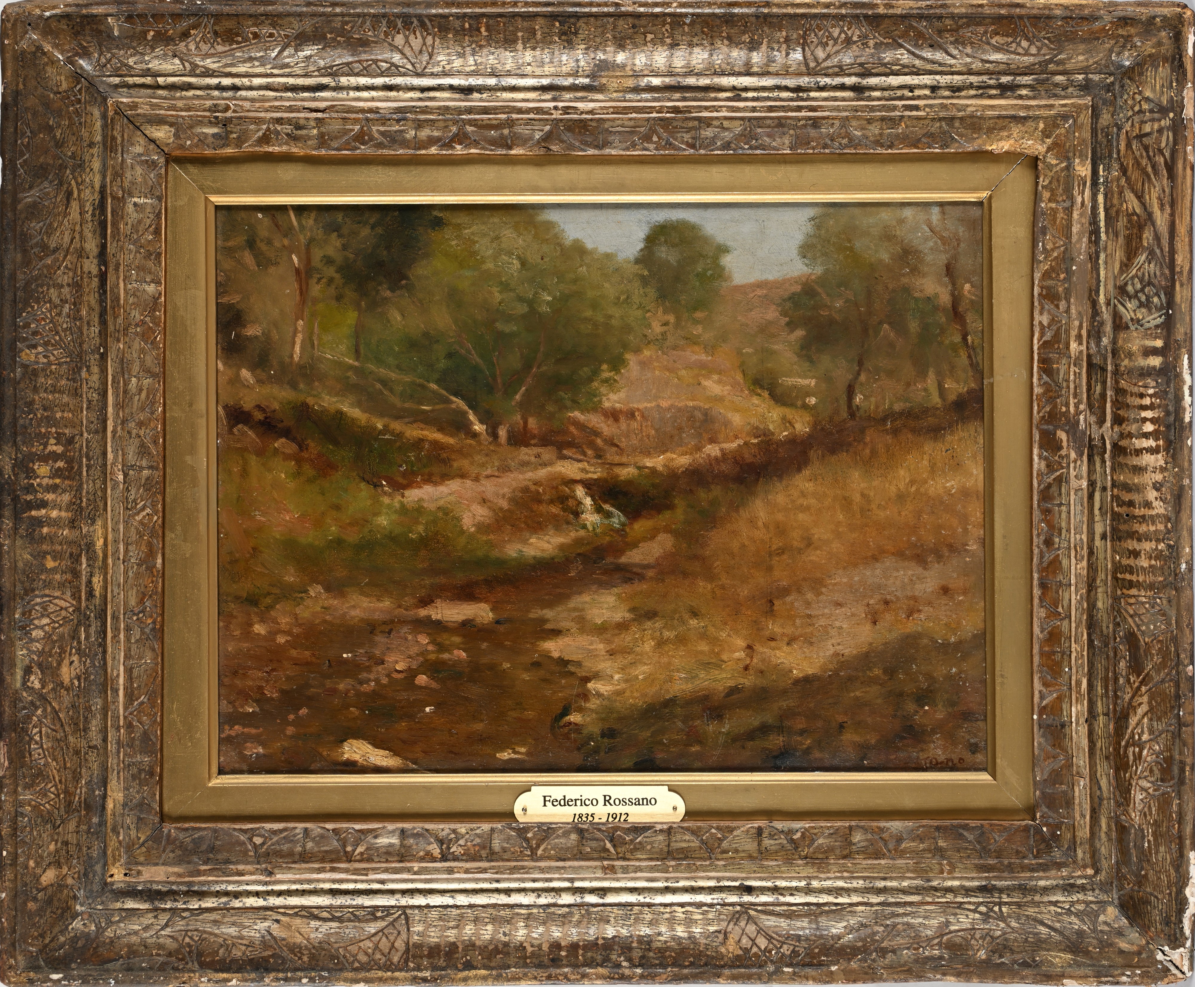 Sul retro: cartellino e timbri della galleria 'La Mediterranea Arte' di Napoli con scritto autore e titolo dell'opera: cartellino e timbri della collezione 'Rosario Macchiarulo' di Salerno.
