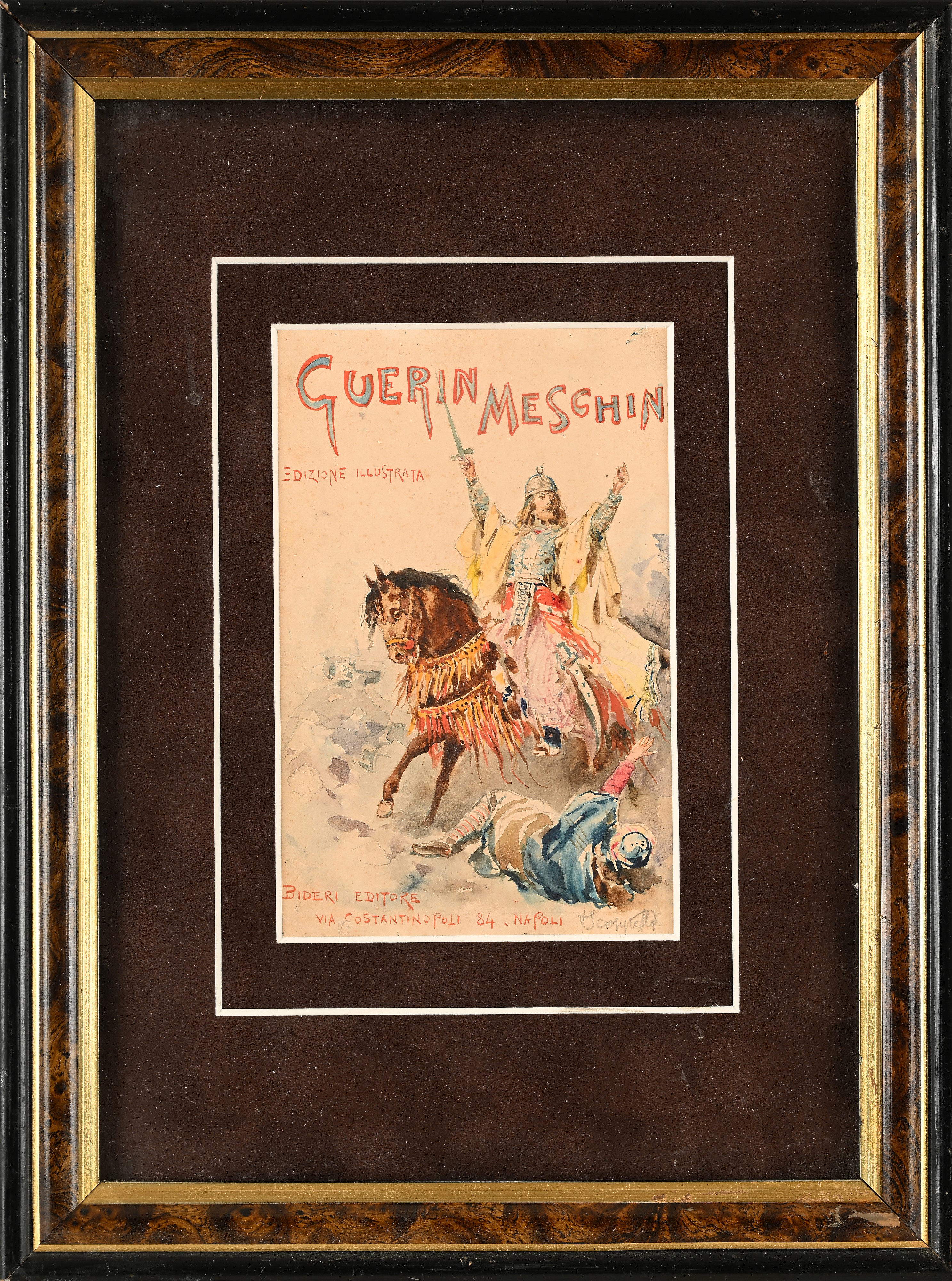 Si tratta di una tavola originale, eseguita per l'editore Bideri di Napoli, per una copertina del libro ‘Guerin Meschin’.