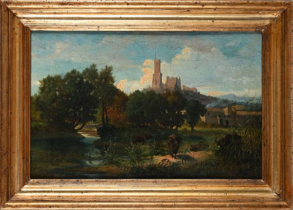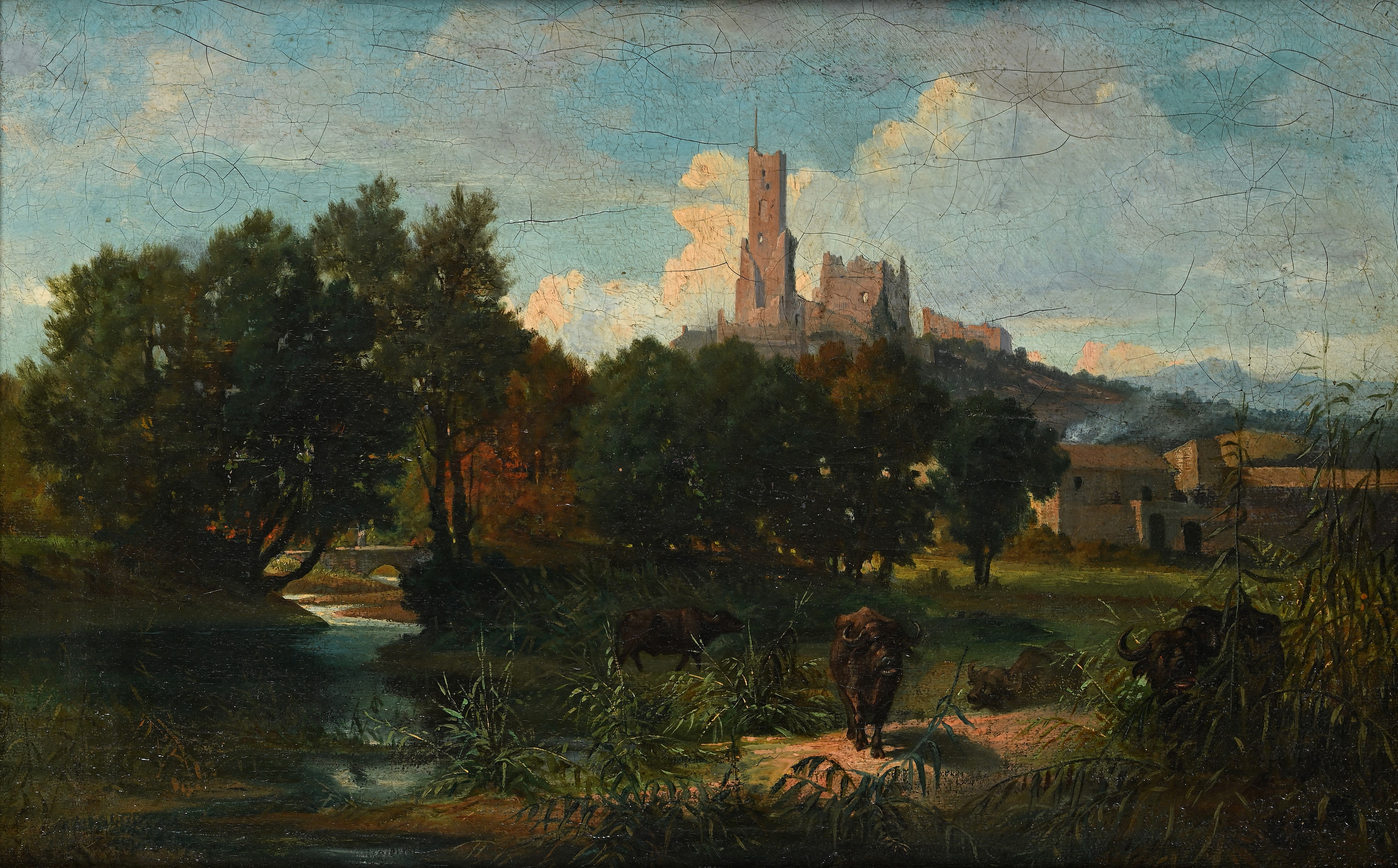 Bufali nei pressi di un ruscello con un antico borgo in lontananza