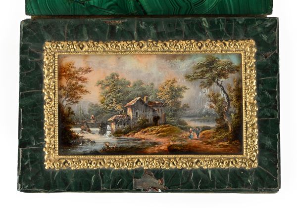 di forma rettangolare con coperchio incernierato in lacca verde scuro, decorato da un paesaggio fluviale con ponticello, casolare e personaggi trattenuto da cornice in bronzo cesellato e dorato; piedi in forma di cartiglio. Difetti, piccole rotture e mancanze