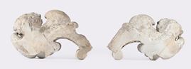 coppia di frammenti architettonici con figure di cherubino idealmente sostenute da elementi incurvati con estremità a ricciolo arricchiti da un cartiglio; un piccolo tassello in marmo verde