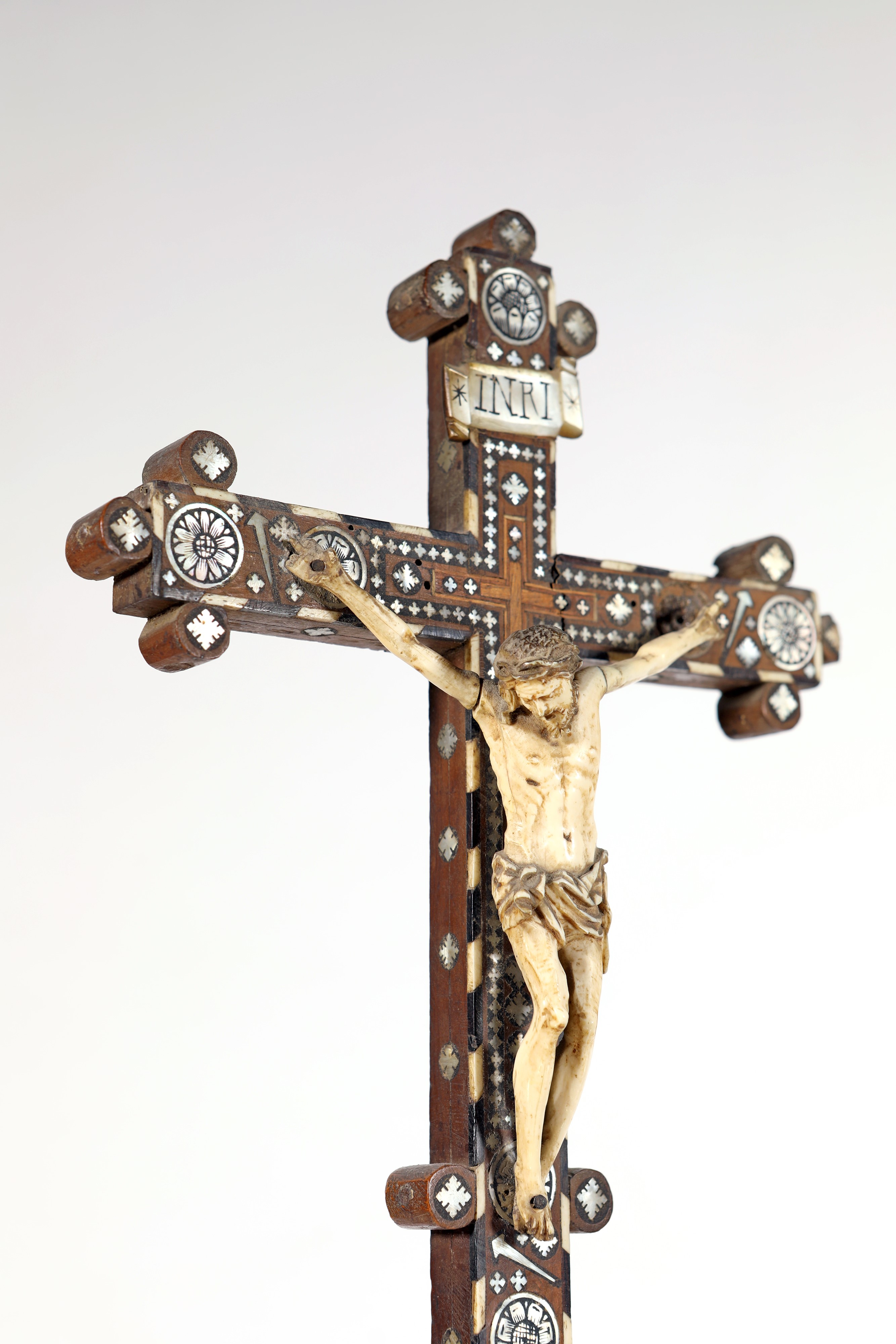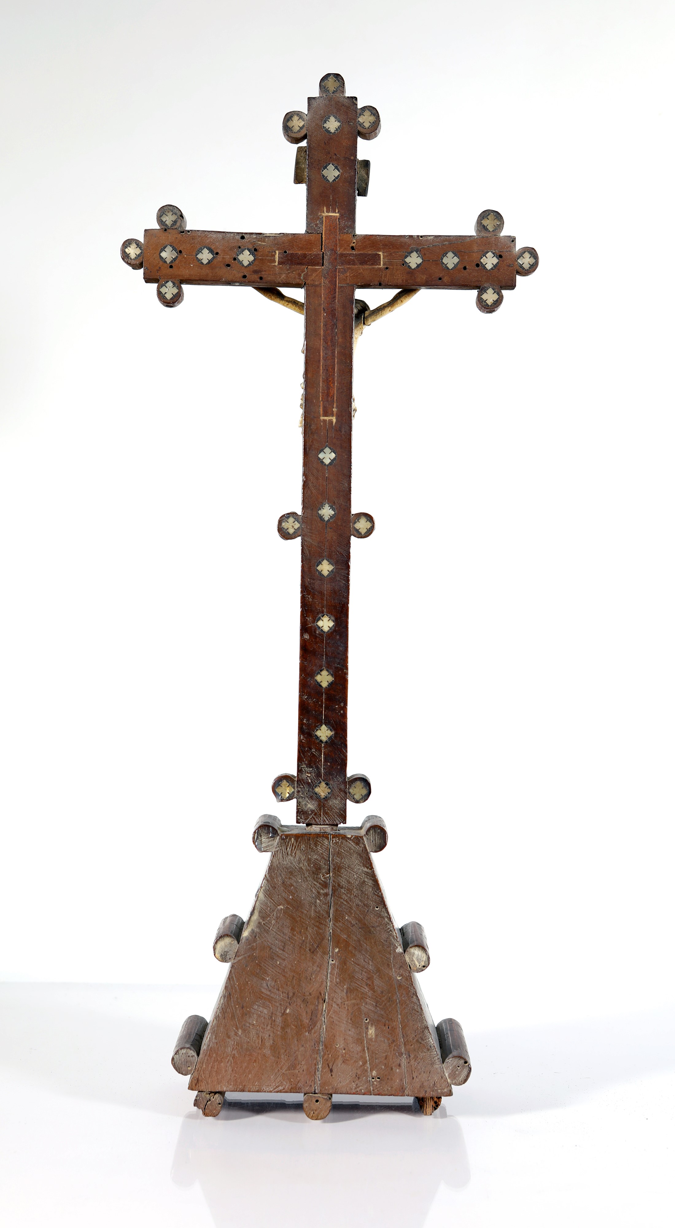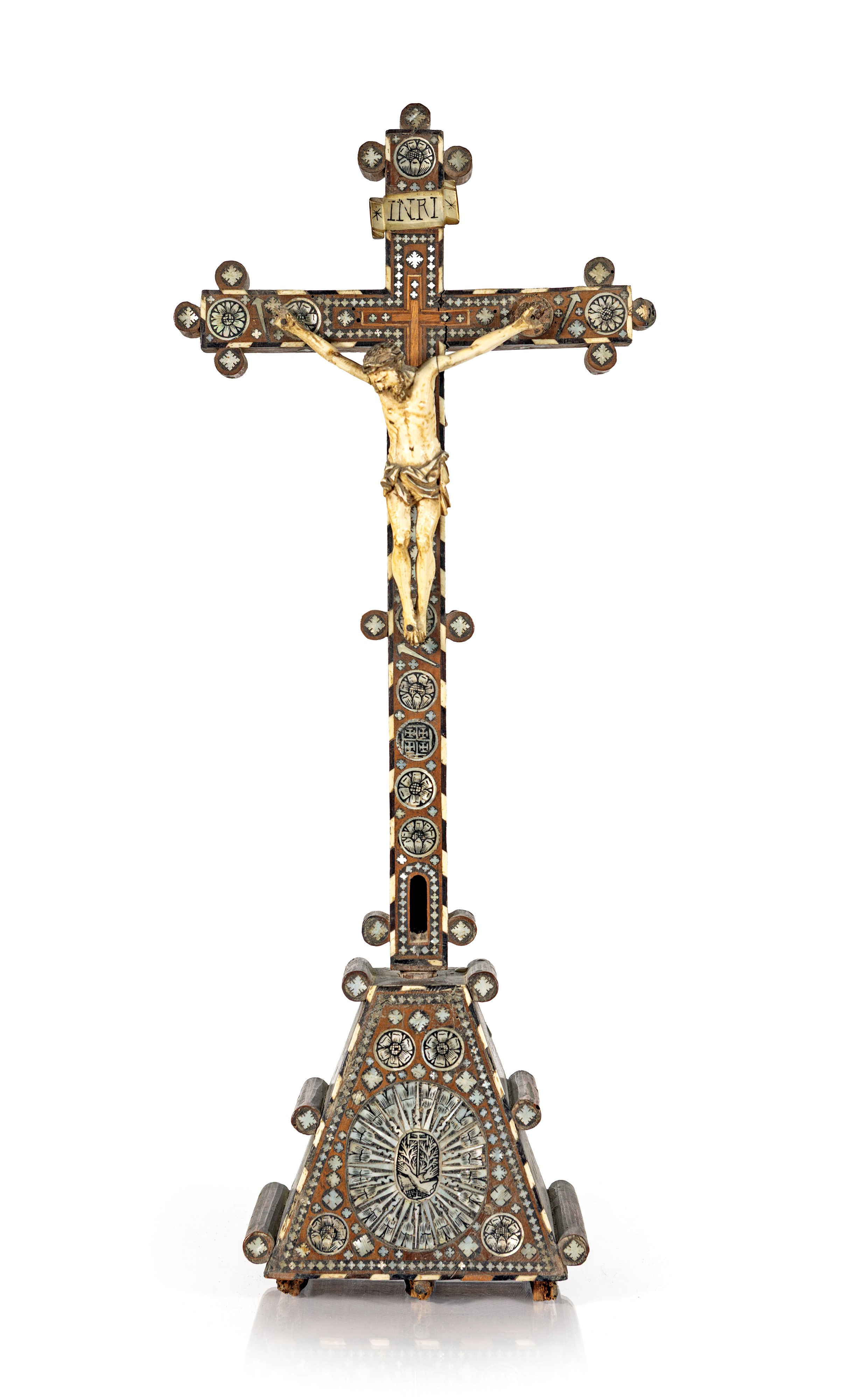 Cristo crocifisso in avorio su croce da tavolo in legno e madreperla, Terra Santa, XIX secolo