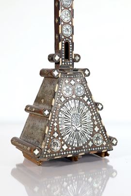 Sulla parte superiore della croce è collocato il Titulus Crucis. La struttura lignea presenta una nicchia portareliquie alla base dell'asse verticale della croce ed è finemente decorata da intarsi in madreperla con motivi geometrici e floreali, caratteristica distintiva degli artigiani attivi in Terra Santa, che producevano manufatti devozionali destinati ai pellegrini e al mercato europeo.