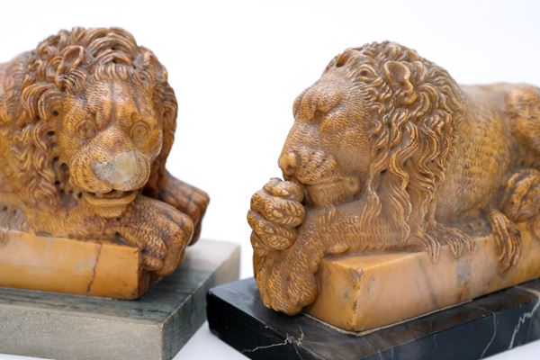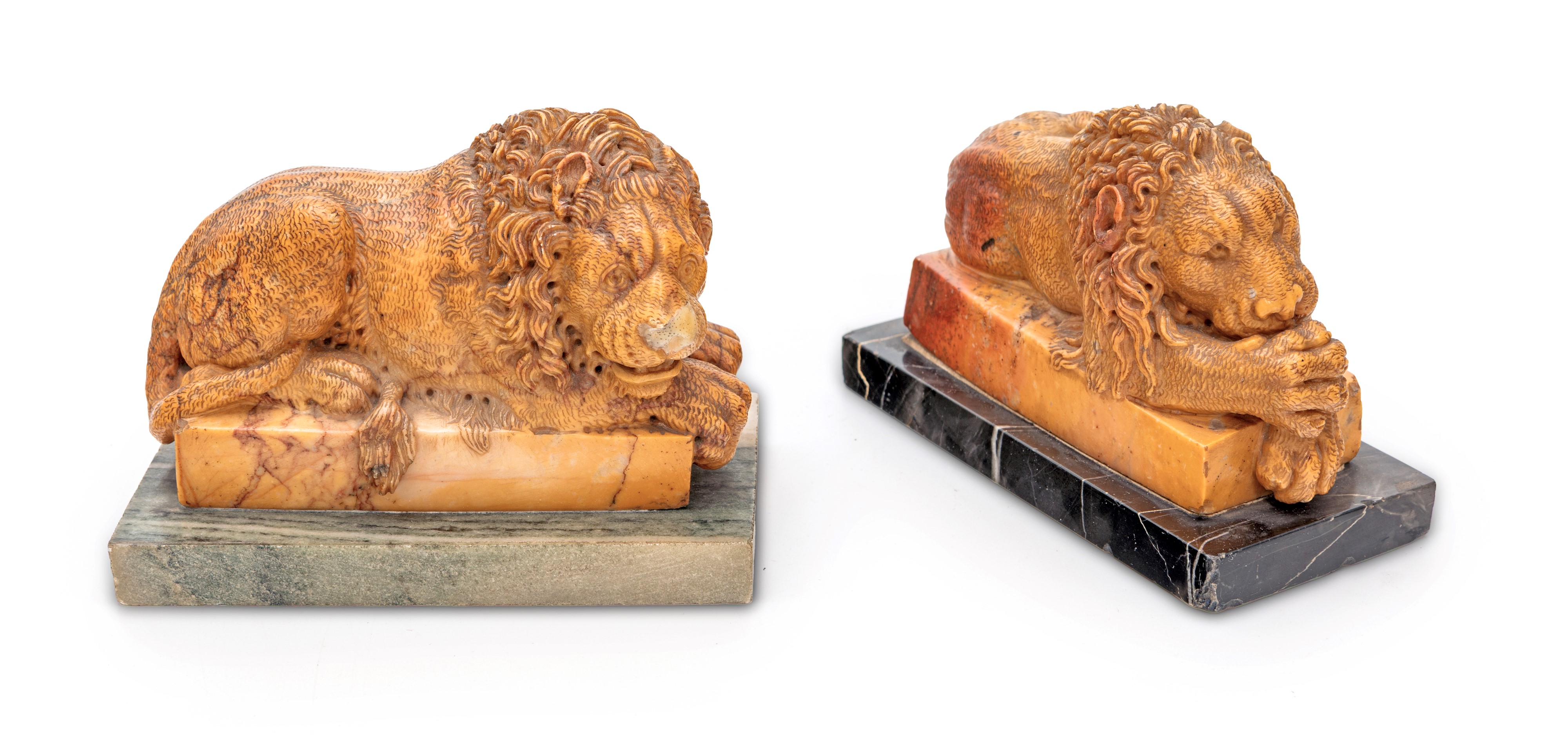 Due piccoli leoni canoviani in marmo giallo di Siena, XVIII secolo
