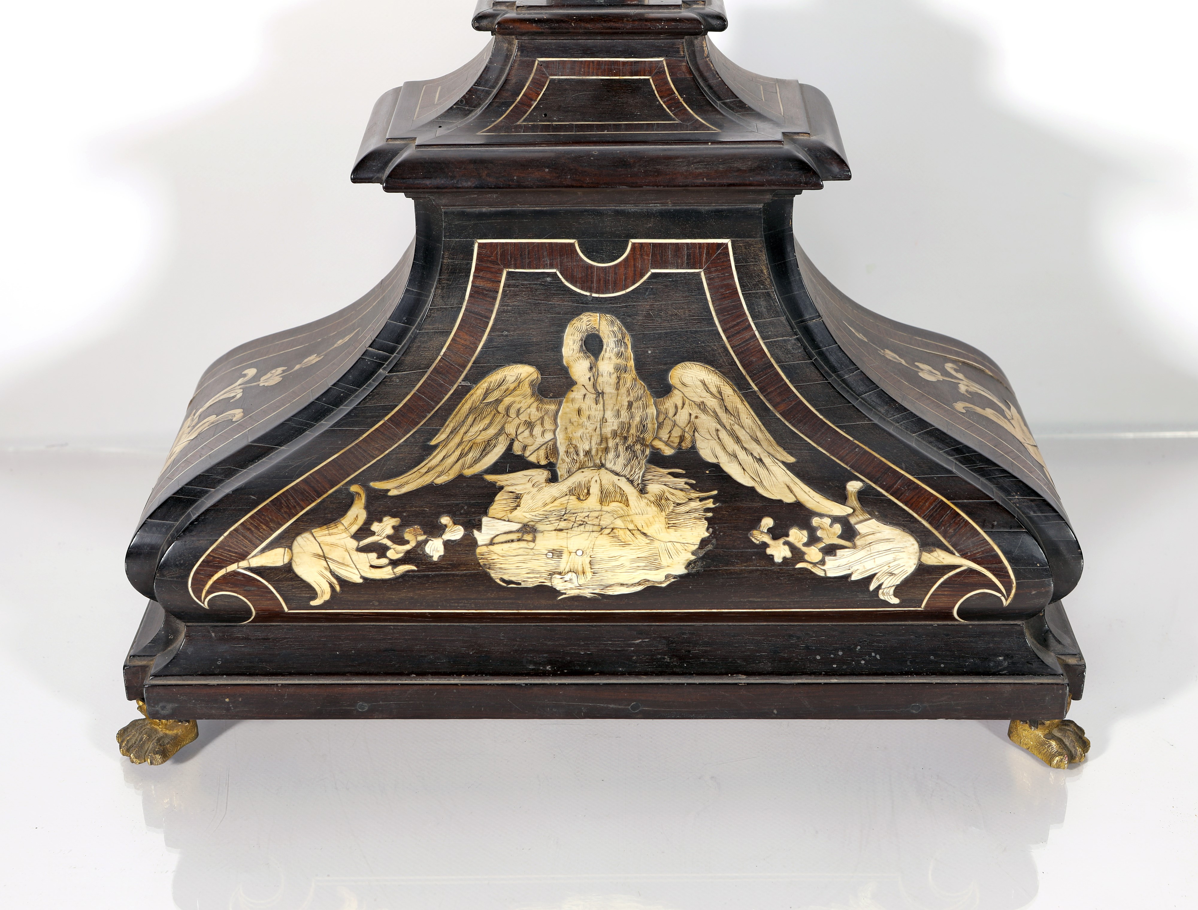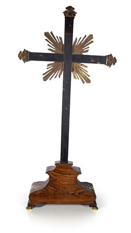terminali e raggiera dorati, base a mensola sagomata la cui forma è sottolineata da sottili filettature in avorio, intarsiata a raffigurare l'emblema dell'eucarestia con figura di pellicano che nutre i suoi piccoli; ai lati della scena si sviluppano eleganti motivi floreali sempre in avorio, che conferiscono alla base un aspetto particolarmente ricercato. Questa croce rappresenta dunque un raffinato esempio di arte sacra, unendo abilmente il simbolismo religioso alla maestria artigianale, testimoniando il forte valore devozionale e liturgico che questi oggetti avevano nelle chiese e nei conventi dell’epoca