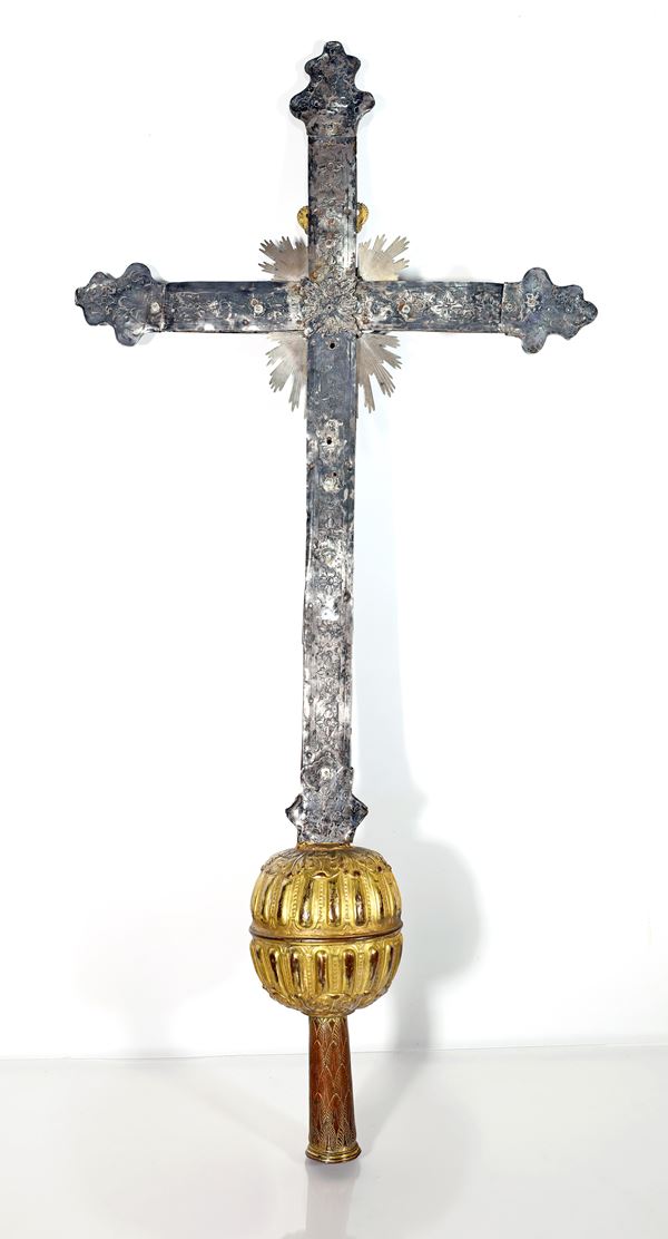 corpus Christi ritratto secondo l'iconografia classica, con corona di spine e sottile aureola ad anello, sormontato da colomba quale simbolo dello Spirito Santo ed ampia raggiera al verso delle assi; titulus crucis in bronzo dorato. Nodo non pertinente in rame dorato. Difetti e mancanze