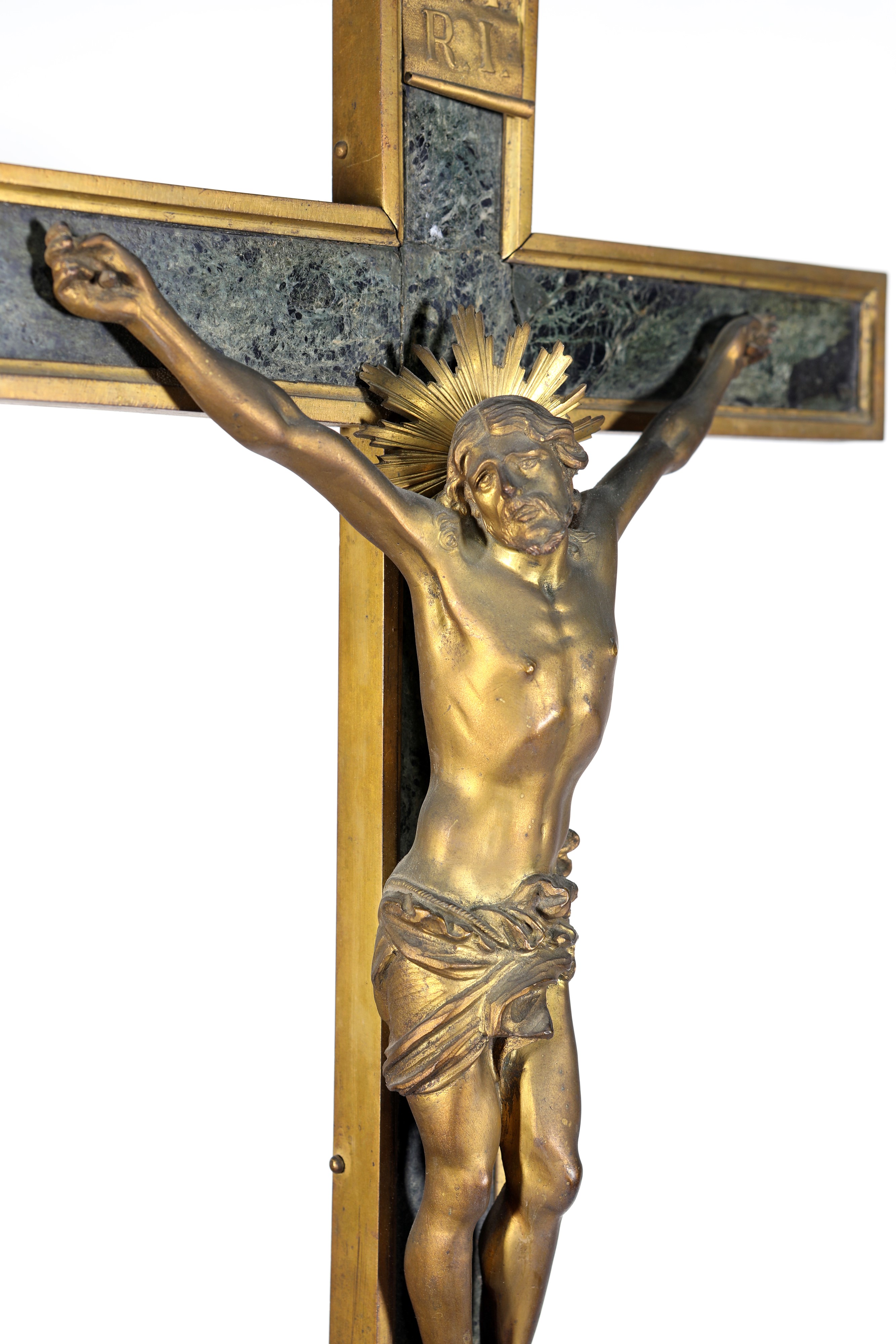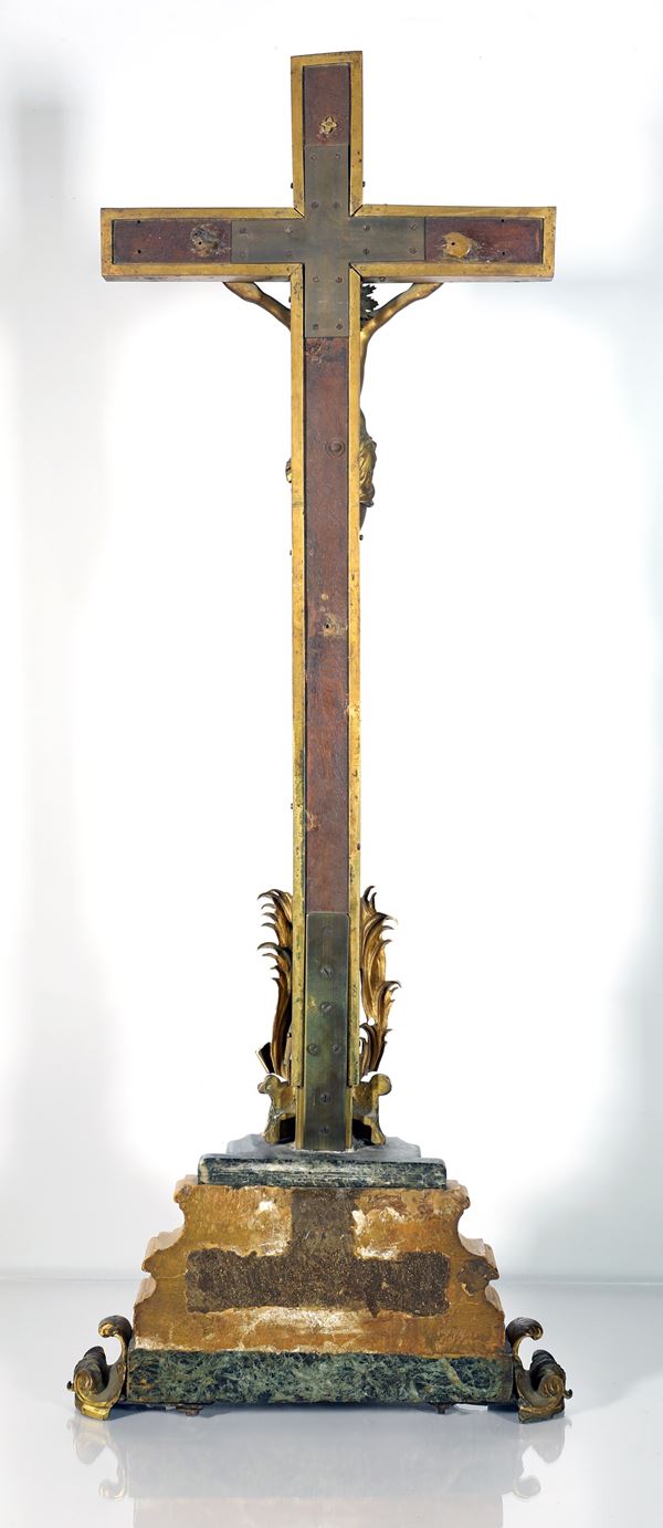 Grande crocifisso da altare in bronzo su base in marmo giallo e verde, Roma, fine XVII/inizi XVIII secolo