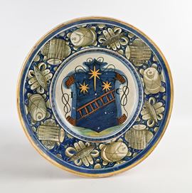 Piatto da pompa in maiolica policroma con stemma e trofei, Casteldurante, prima metà XVI secolo