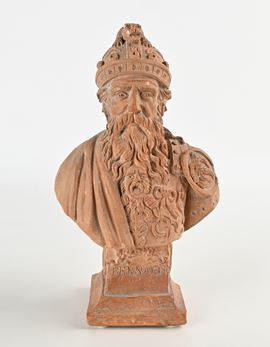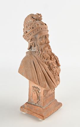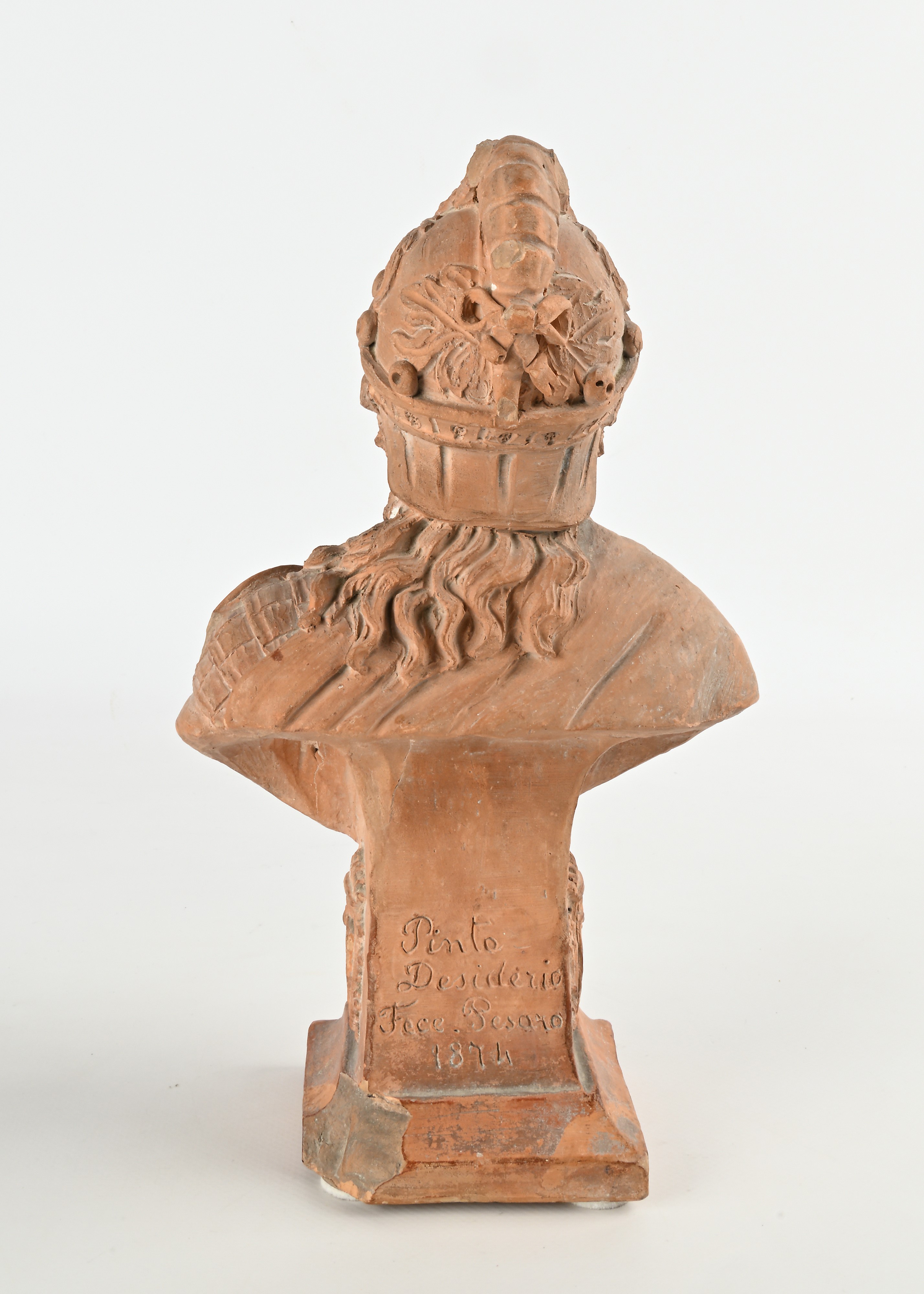 Piccolo busto in terracotta raffigurante un uomo con lunghi capelli sciolti sulla nuca e folta barba ricadente sulla corazza modellata in rilievo con mascheroni e nastri annodati; in testa elmo da parata a calotta con paranuca idealmente trattenuto da corona ferrea, decorato da rilievi vegetali e sormontato da cimiero zoomorfo; piedistallo squadrato con iscrizione frontale "Bernardo"; ai lati scudi per accogliere stemmi araldici, sormontati da corona radiata a sette punte. Al verso firma e data incussa in pasta: "Pinto Desiderio fece Pesaro 1874". Mancante un angolo posteriore del piedistallo.