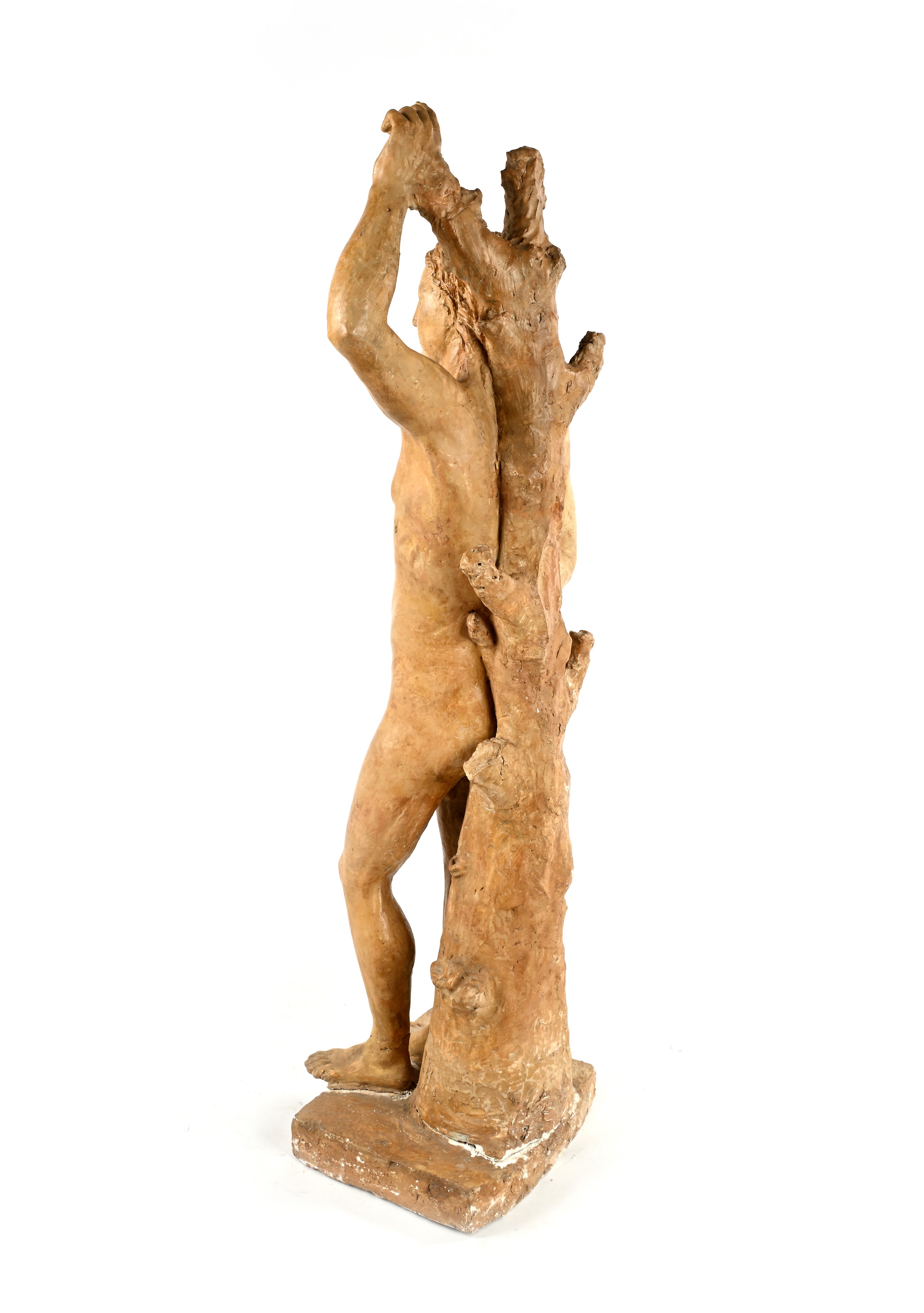 L'impostazione della figura trova ispirazione dall'Apollino e dall'Afrodite di Prassitele; il Santo è rappresentato a tutto tondo, in piedi con la schiena appoggiata ad un tronco d'albero secondo l'iconografia tradizionale; il peso del corpo sostenuto dalla gamba destra, il braccio corrispondente legato all'altezza della vita al tronco dell'albero, il braccio sinistro sollevato. Ha la testa incorniciata da una folta e lunga capigliatura, lo sguardo privo di espressione rivolto verso lo spettatore e la bocca socchiusa. Base squadrata. Rotture e restauri.