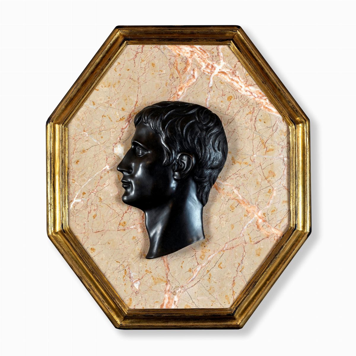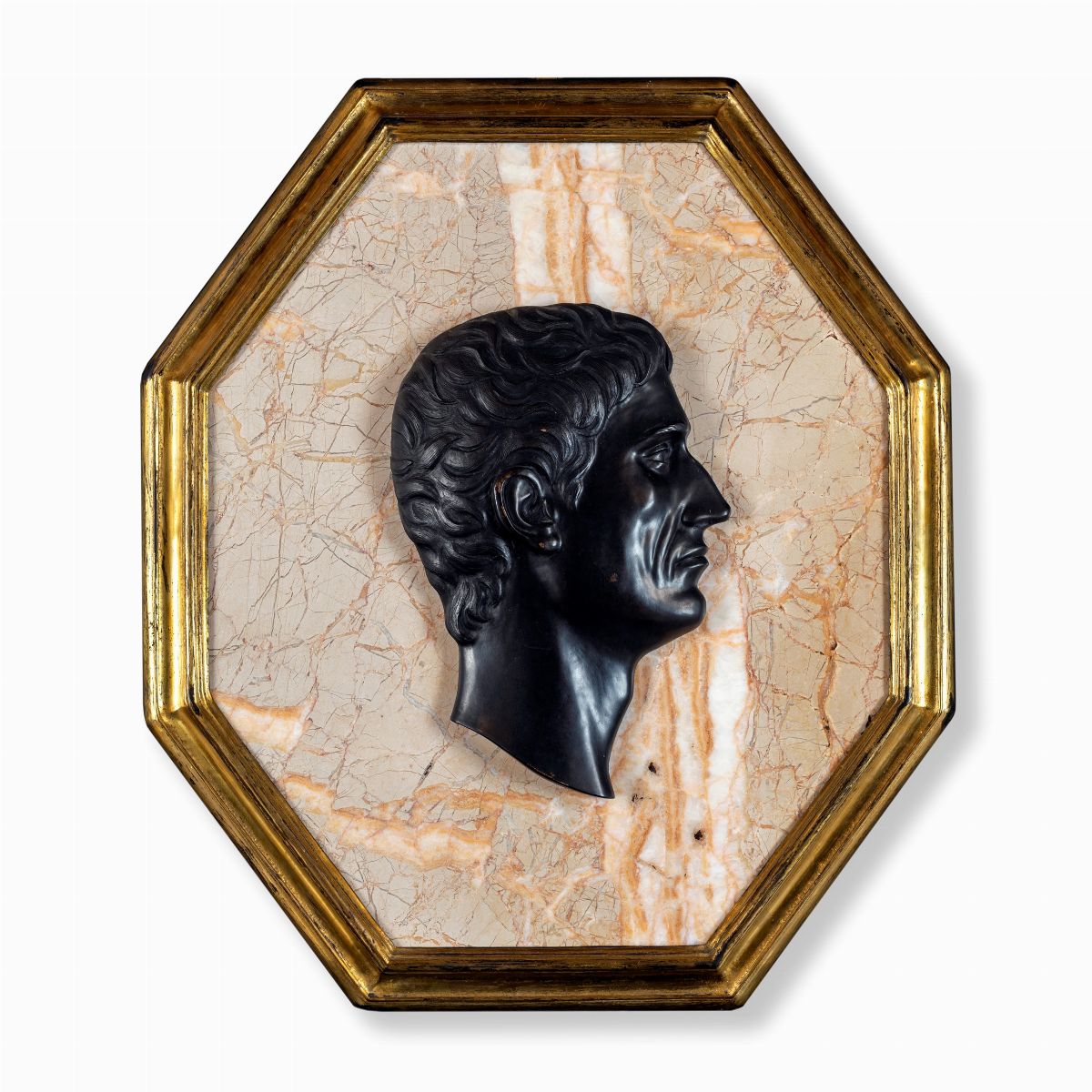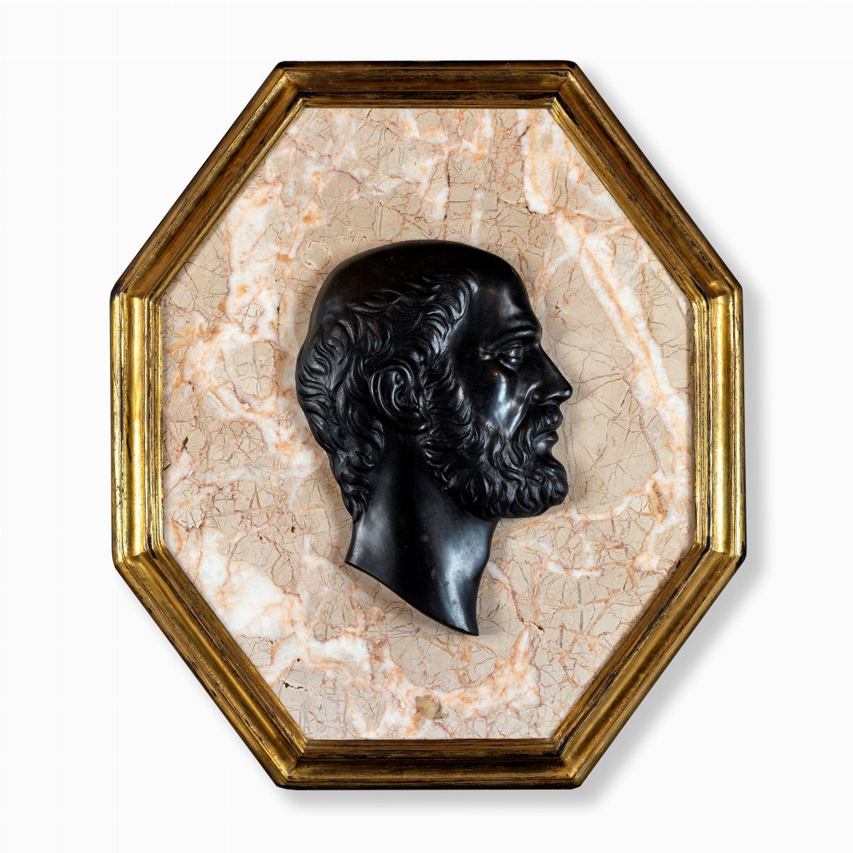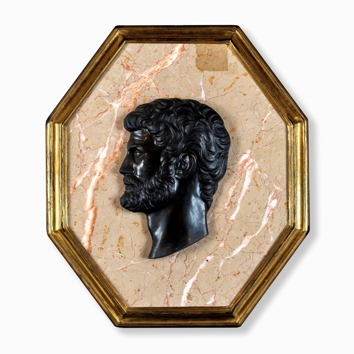 Quattro grandi medaglioni di gusto neoclassico in marmo e bronzo, XIX secolo