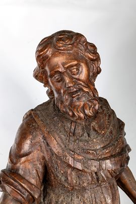 la figura è realizzata da un unico blocco di legno, privato del midollo e svuotato al verso in tutta la lunghezza; le braccia, realizzate a parte, sono fissate tramite chiodi in legno. Il volto, lievemente inclinato e rivolto verso la spalla destra, la bocca socchiusa incorniciata da lunghi baffi e barba. Lievi difetti e piccole mancanze