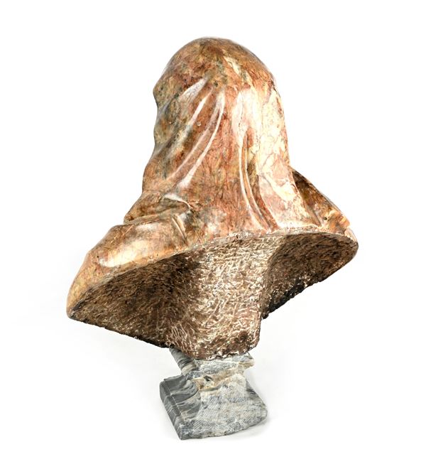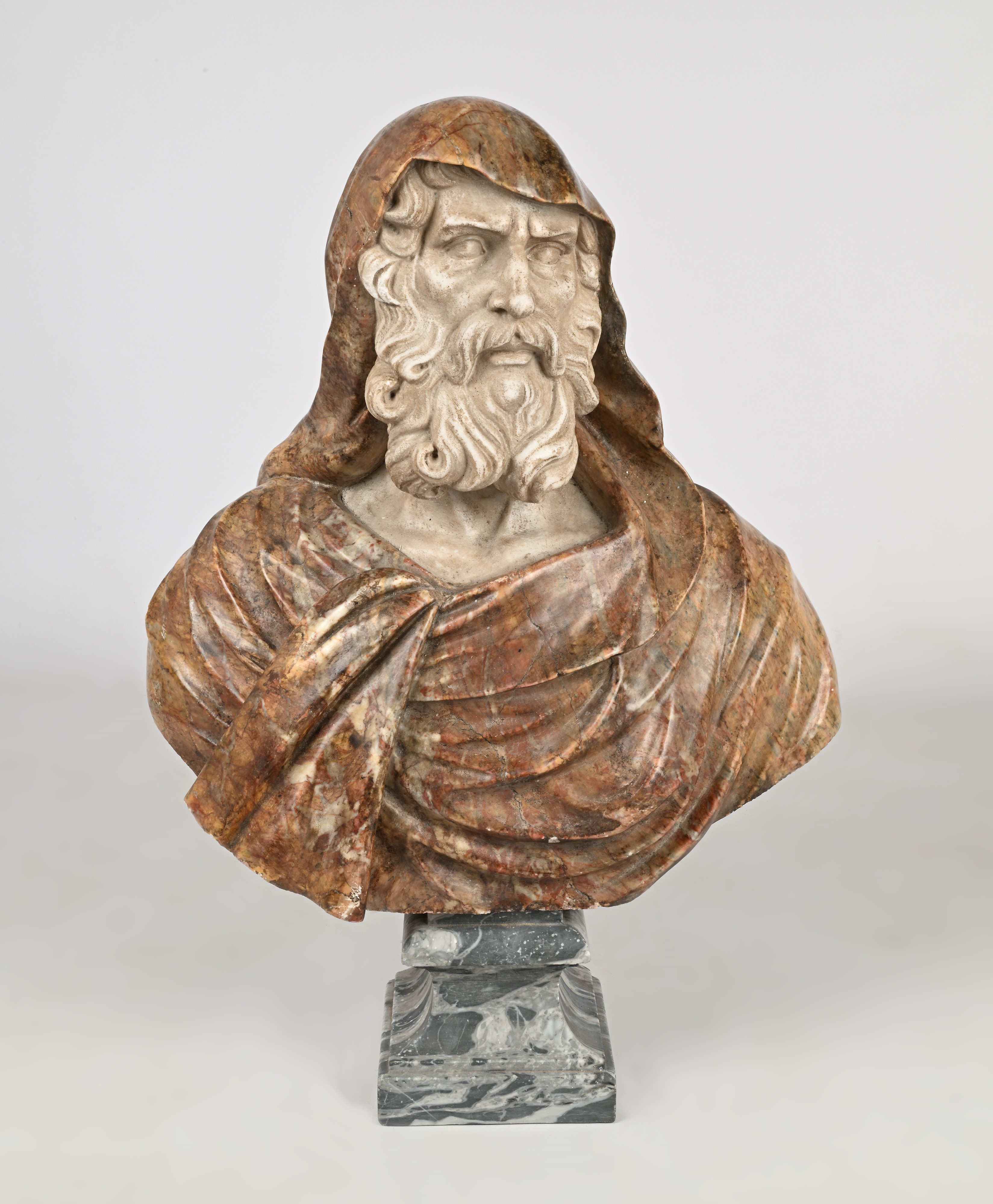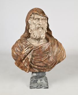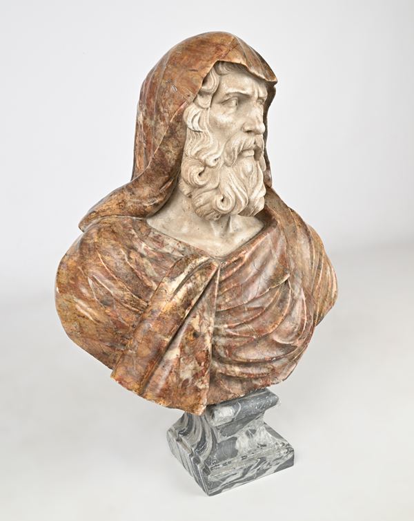 busto in marmo raffigurante un anziano con il volto accigliato ornato da una lunga e folta barba e con il capo coperto dal cappuccio del mantello; piedistallo squadrato in marmo grigio (altezza cm 18). Piccoli difetti