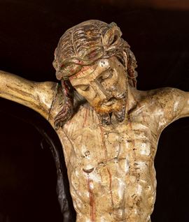 la figura di Cristo, trafitto da tre chiodi (due per le mani e uno per i piedi), è raffigurato con gli occhi chiusi e la testa coronata di spine inclinata verso destra; il corpo con i segni della passione, coperto unicamente da un perizoma dorato annodato sul basso ventre. Supporto triangolare in plexiglass. Piccole mancanze
