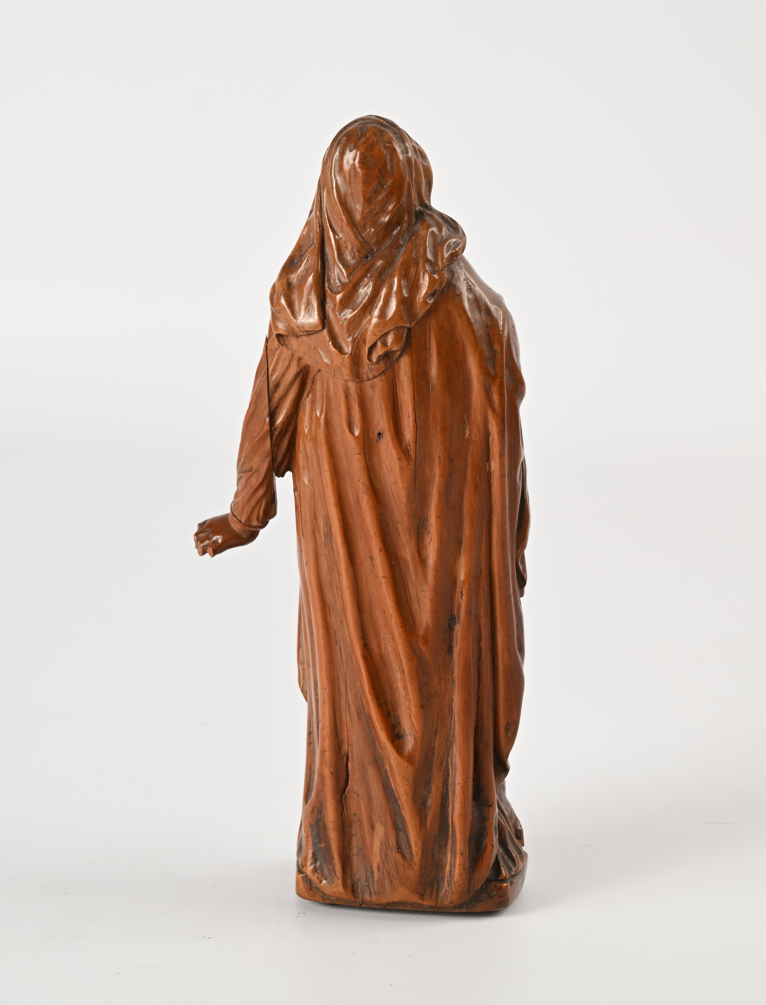 la figura di Maria, ritratta con lo sguardo melanconico. la mano destra sul cuore e la sinistra rivolta verso il basso; il manto ed il panneggio sapientemente intagliati danno l'impressione di un leggero movimento alla figura. Piccole mancanze