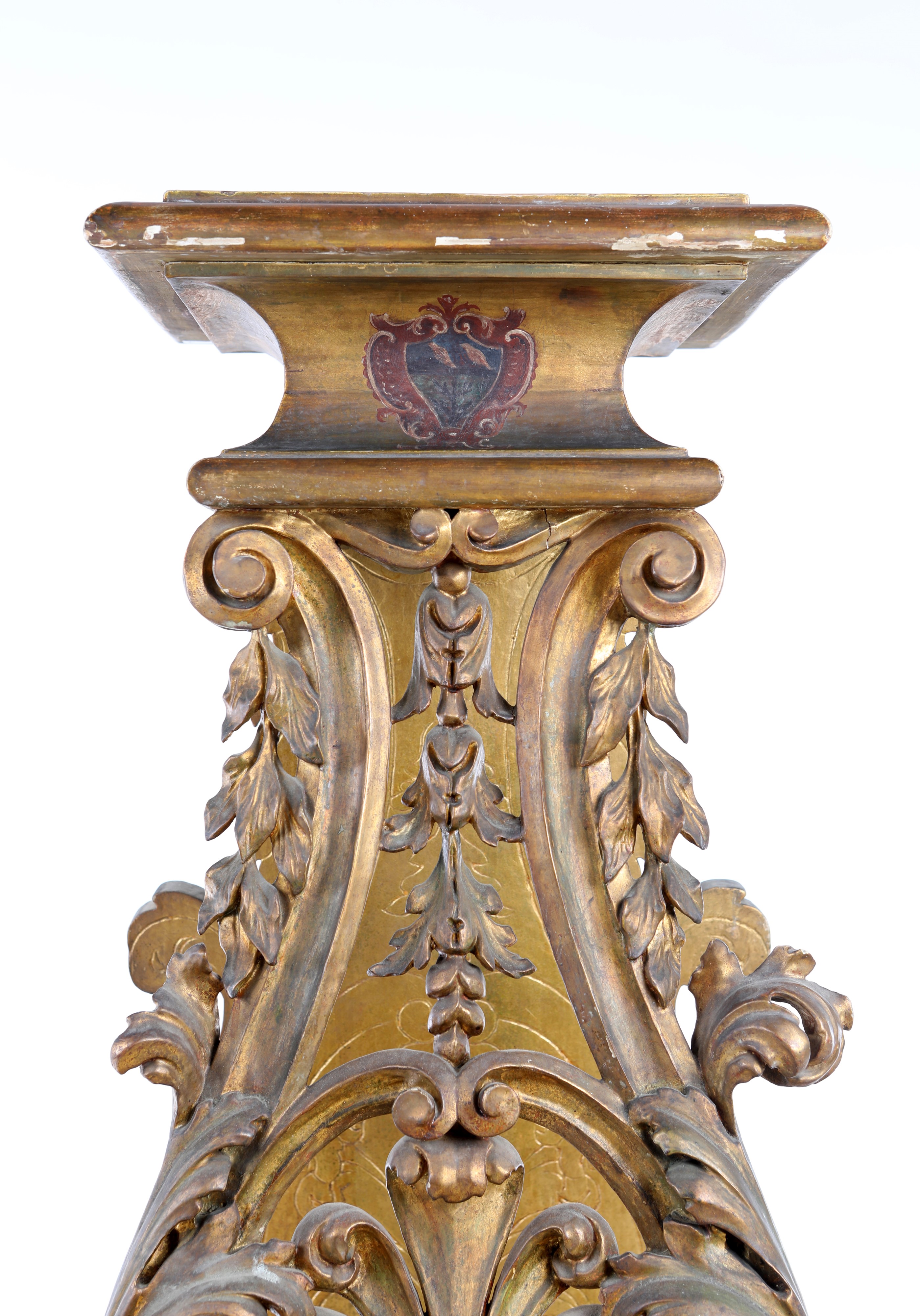 piano d'appoggio quadrangolare con stemma araldico dipinto in policromia posto al centro del cavetto, sostegni di linea sagomata, quello anteriore sottolineato da volute vegetali ed impreziosito da cascatelle minuziosamente intagliate; piedi ferini