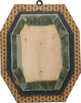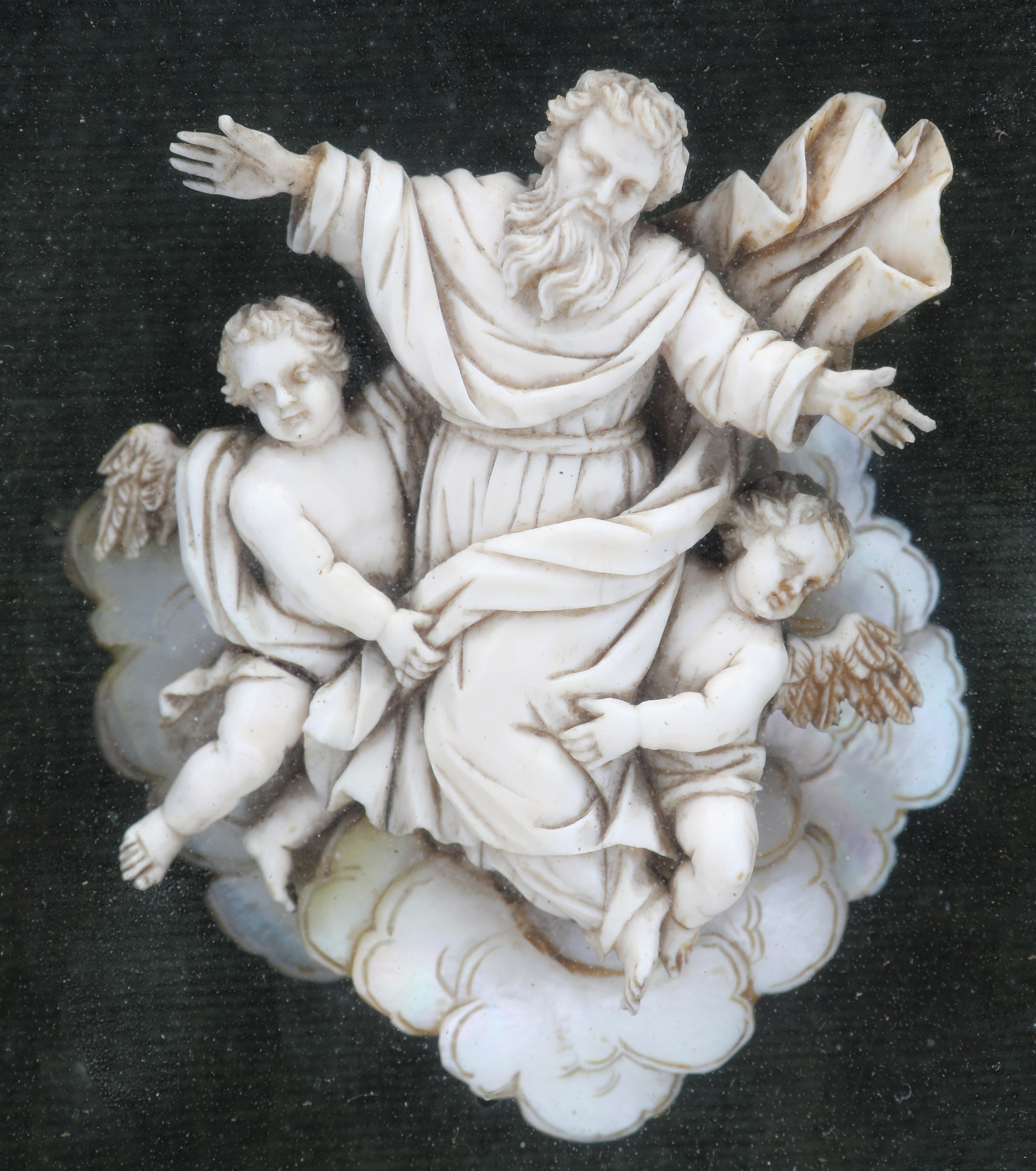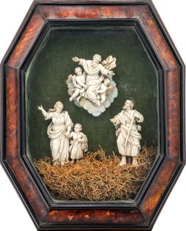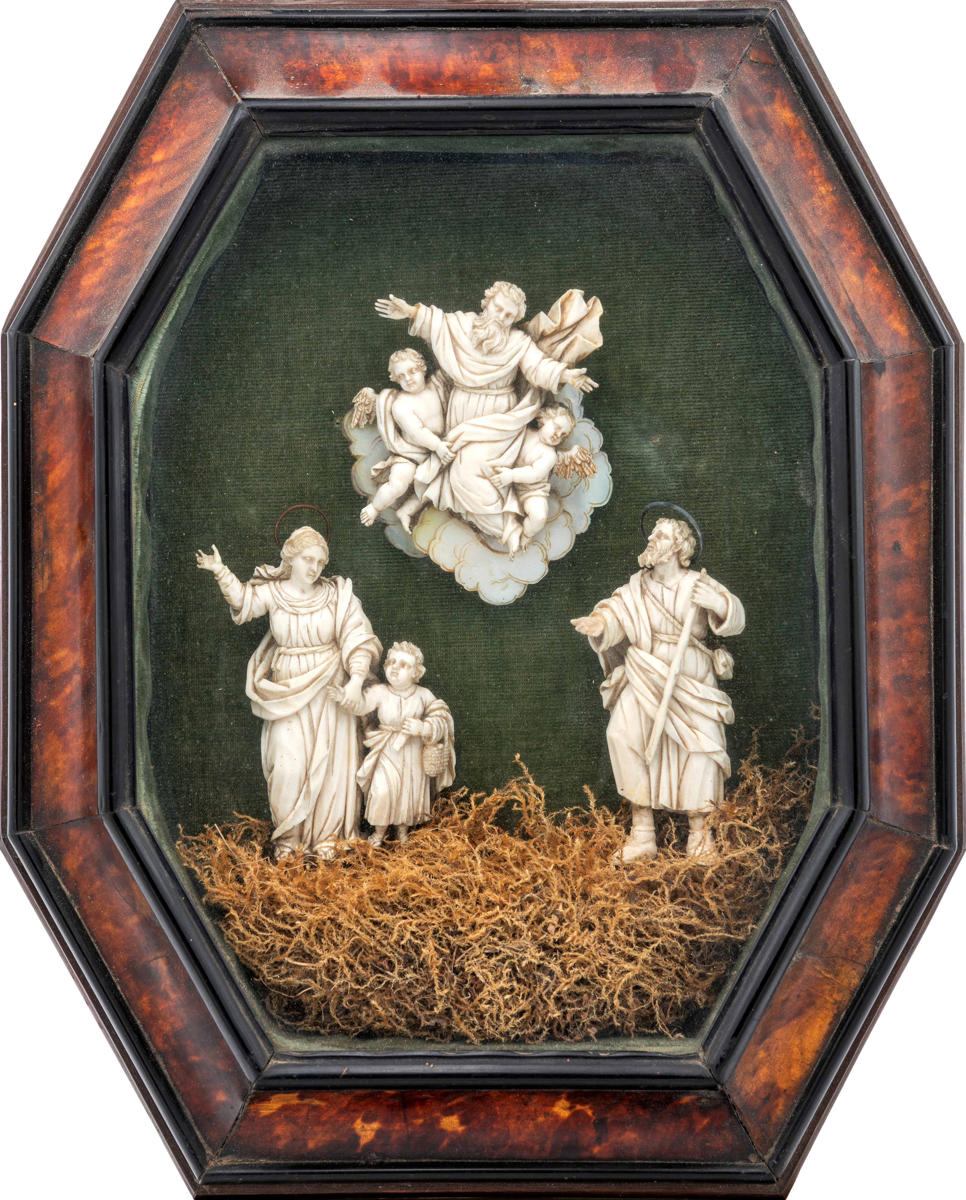 La composizione, costituita da tre gruppi in avorio ambientati su un fondo erboso di muschio ed applicati su tavoletta rivestita di velluto, si articola su due livelli distinti che creano un effetto di profondità e movimento ed è racchiusa in una cornice ottagonale in legno ebanizzato a fascia concava lastronata in tartaruga. In basso si trovano le figure della Vergine Maria, raffigurata con il capo leggermente inclinato in un atteggiamento di protezione materna, in cammino col Bambino Gesù tenuto per mano; a destra San Giuseppe, che avanza reggendo un bastone e una bisaccia da viandante, simbolo del viaggio intrapreso per mettere in salvo la Sacra Famiglia. Le vesti delicatamente scolpite presentano pieghe morbide e fluide che donano naturalezza e dinamismo alla scena. In alto, idealmente sospeso su nuvole in madreperla intagliata, compare Dio Padre con drappo svolazzante e le braccia aperte in un gesto di benedizione, affiancato da due angeli.