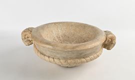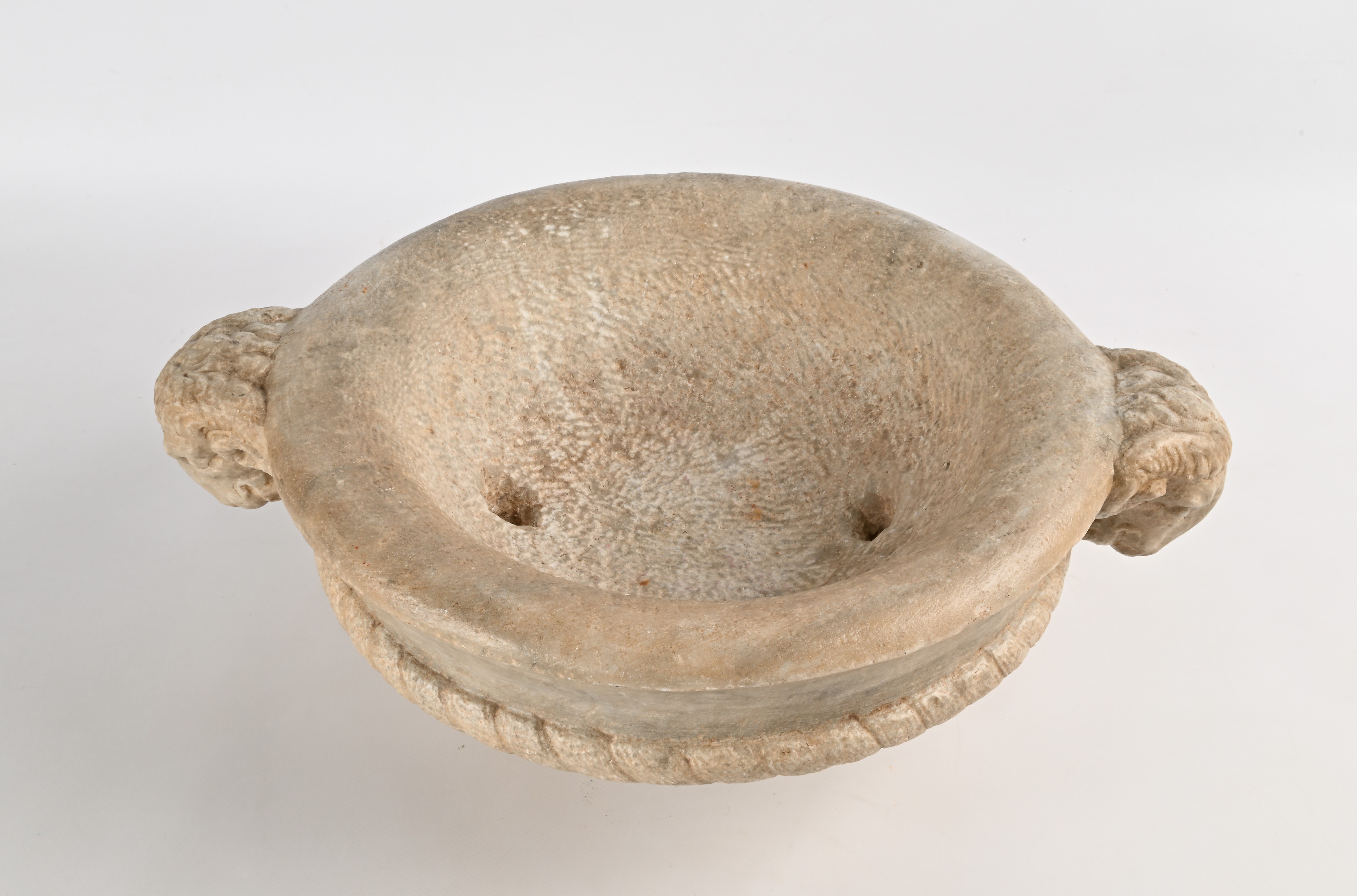di forma circolare con anse scultoree in forma di testa di ariete; un cordolo ritorto definisce la fascia; la parte convessa esterna è sottolineata da lunghe foglie lanceolate. All'interno due fori passanti per l'uscita dell'acqua