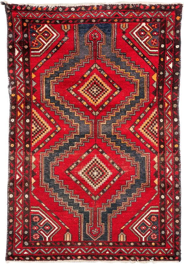 esempio dell'arte tessile tribale persiana, caratterizzato dalla tipica suddivisione a losanghe che incorniciano [..], cm 208x148