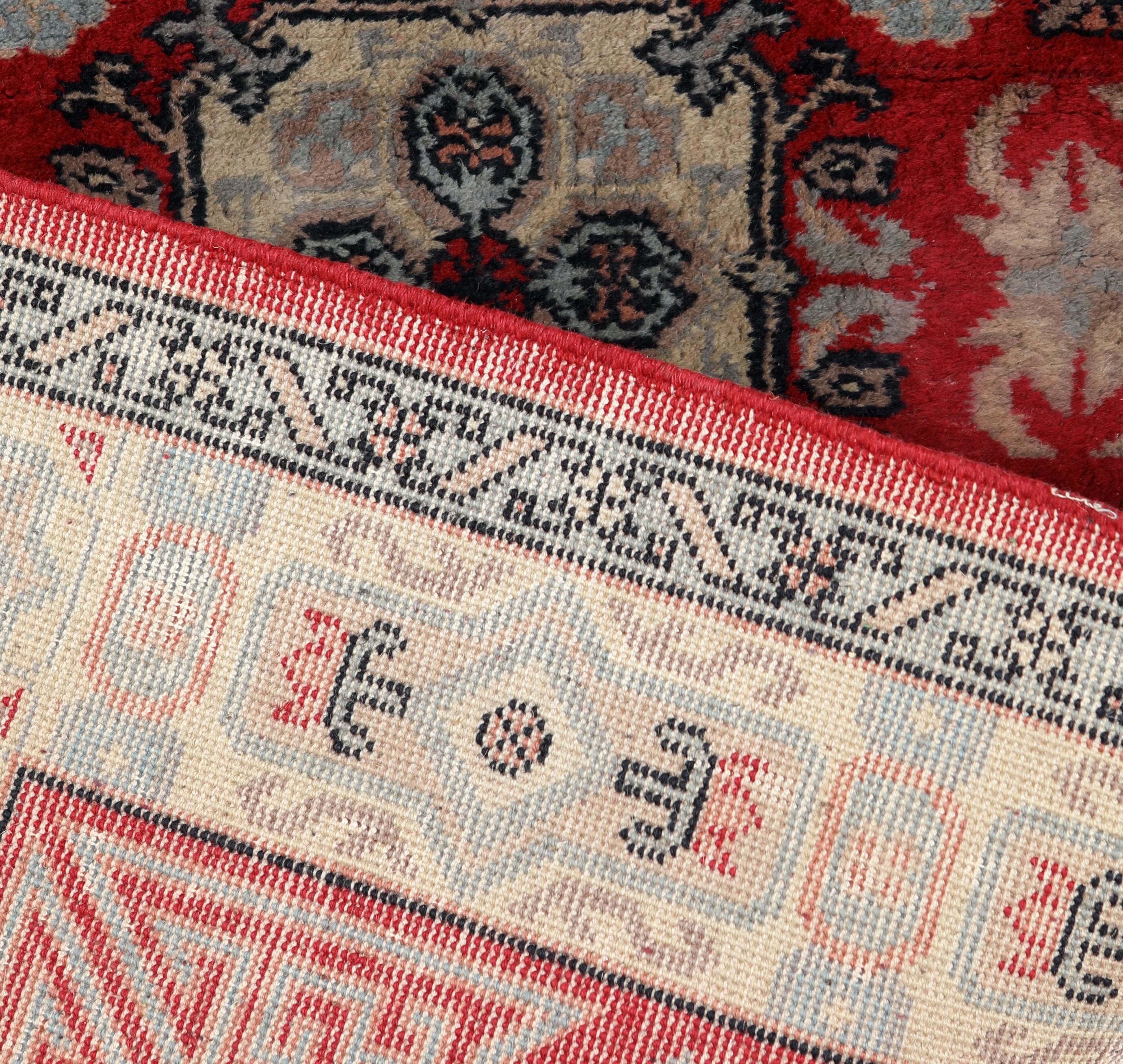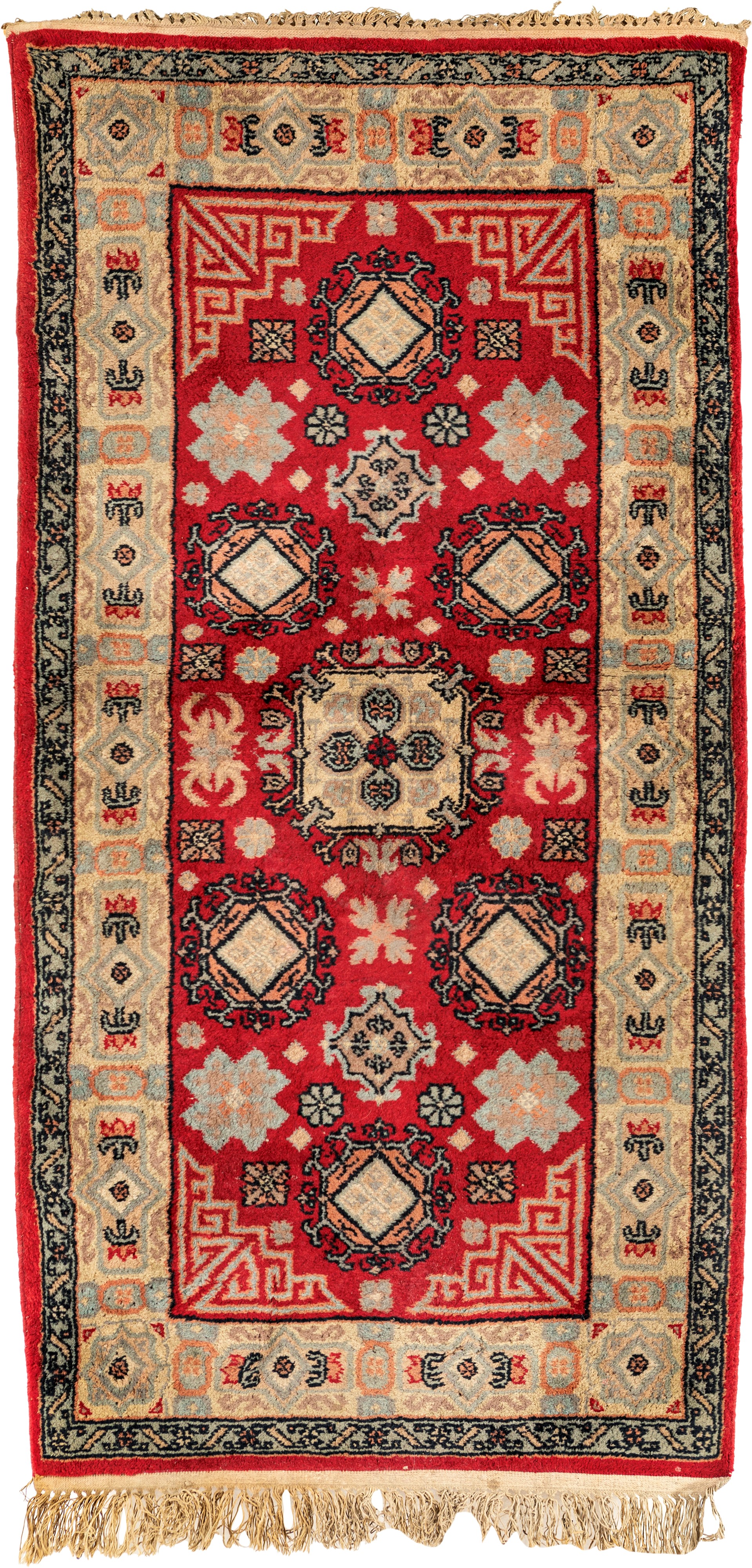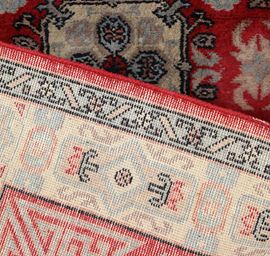 caratterizzato da un fondo rosso acceso, decorato con motivi geometrici simmetrici e floreali stilizzati. Il design è dominato da medaglioni centrali e una bordura con motivi angolari a greca, che contribuiscono all'equilibrio visivo del tappeto.