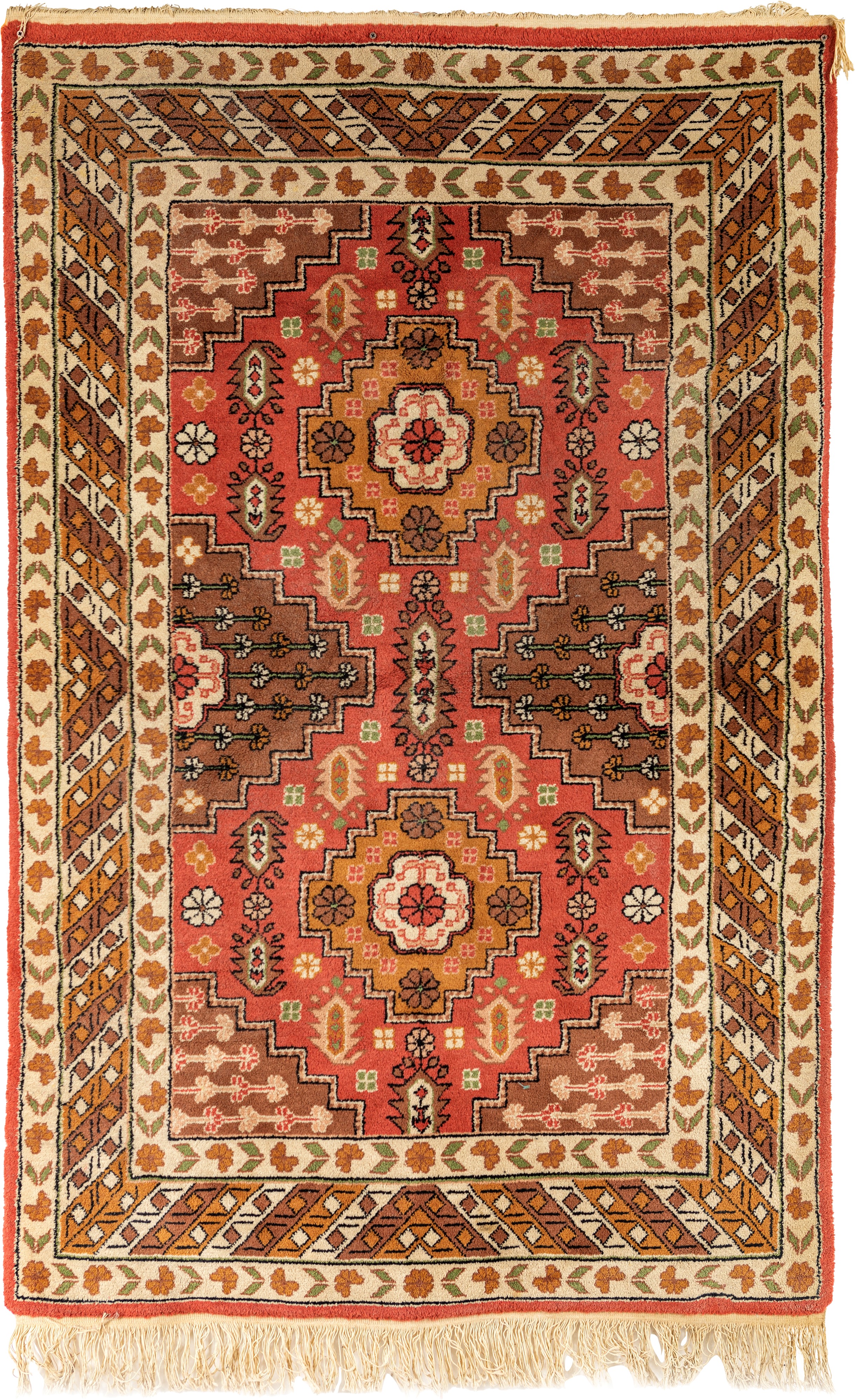 esempio della tradizione tessile turca, caratterizzato da un design raffinato e colori caldi ed equilibrati. Al centro del campo spicca un grande medaglione floreale circondato da motivi geometrici e dettagli floreali stilizzati.