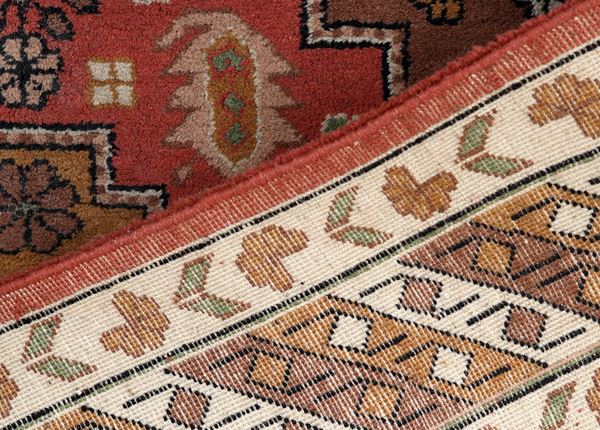 Le tonalità predominanti, come il rosso mattone e il marrone, si combinano armoniosamente con sfumature più chiare di avorio e giallo ocra, creando un effetto visivo equilibrato e accogliente. La bordura presenta decorazioni geometriche intrecciate con elementi floreali, donando al tappeto un ulteriore senso di profondità e movimento.