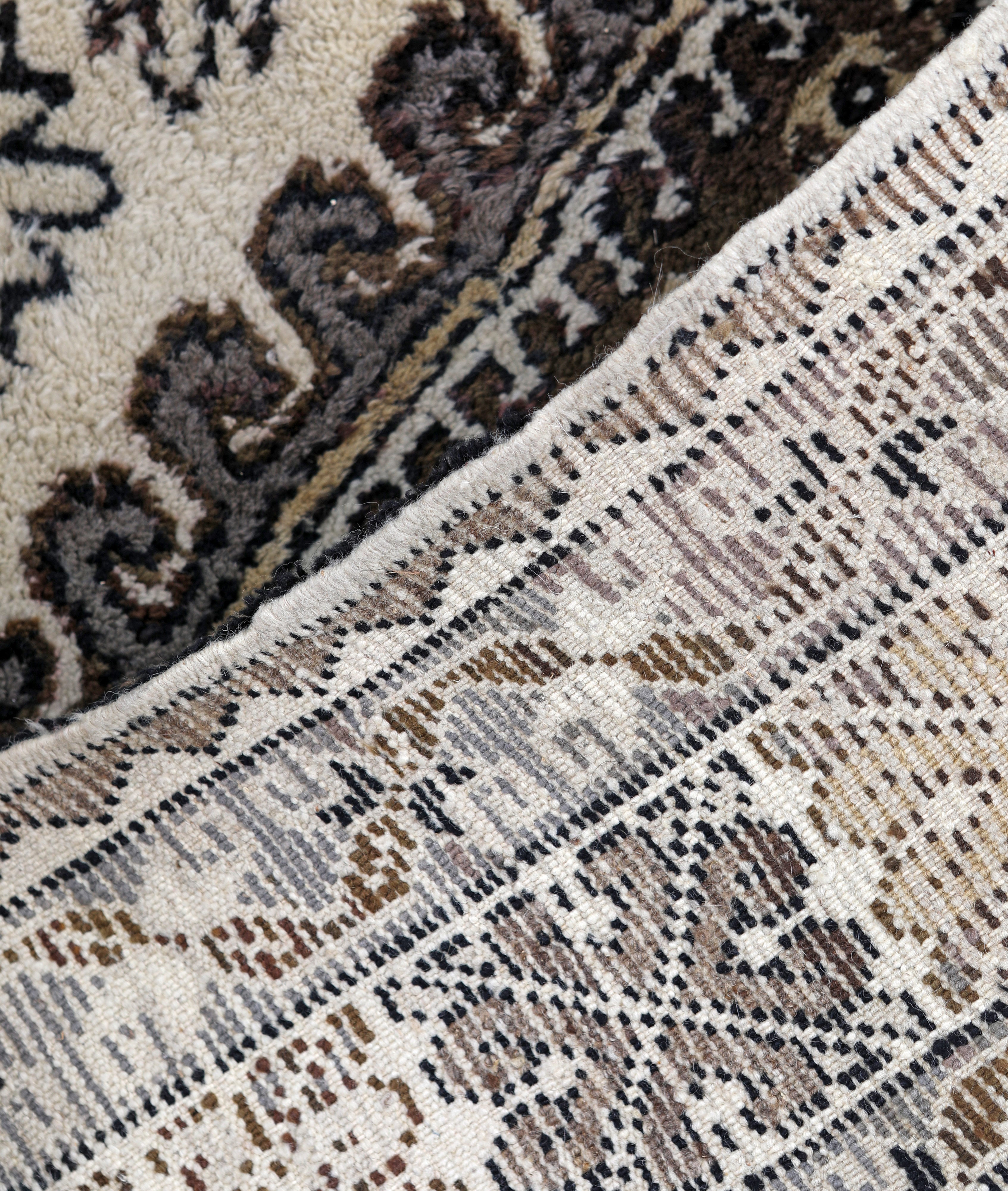 aratterizzato da una palette cromatica in toni naturali di beige, marrone e nero, tipica della tradizione tessile del Nord Africa. Il grande medaglione romboidale centrale, decorato con motivi geometrici stilizzati, è un elemento distintivo dei tappeti delle tribù berbere, simbolo di protezione e spiritualità. Il campo è arricchito da motivi ripetuti e dettagliati, che conferiscono movimento e armonia al disegno. La cornice è composta da più fasce con motivi geometrici e simbolici, elementi tradizionali della cultura berbera.
