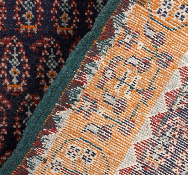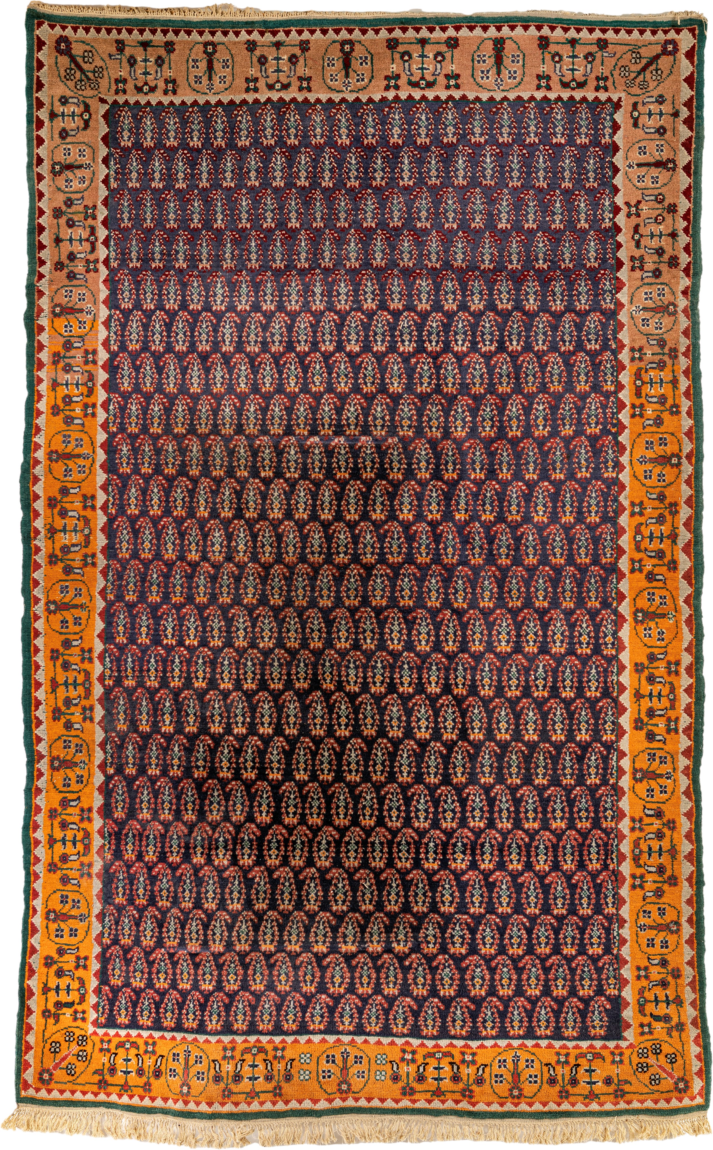 Il campo centrale è caratterizzato da una fitta ripetizione del motivo boteh, simbolo di fertilità e prosperità, su un fondo blu notte che dona profondità e raffinatezza al disegno.