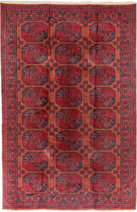 caratterizzato da una ripetizione regolare di "gul" (motivi ottagonali) su un campo rosso mattone uniforme. I dettagli in nero e blu scuro creano un raffinato contrasto, enfatizzando la precisione geometrica del design. Il bordo è ornato con motivi floreali stilizzati e figure simmetriche, incorniciando il tappeto con un senso di equilibrio armonico.
