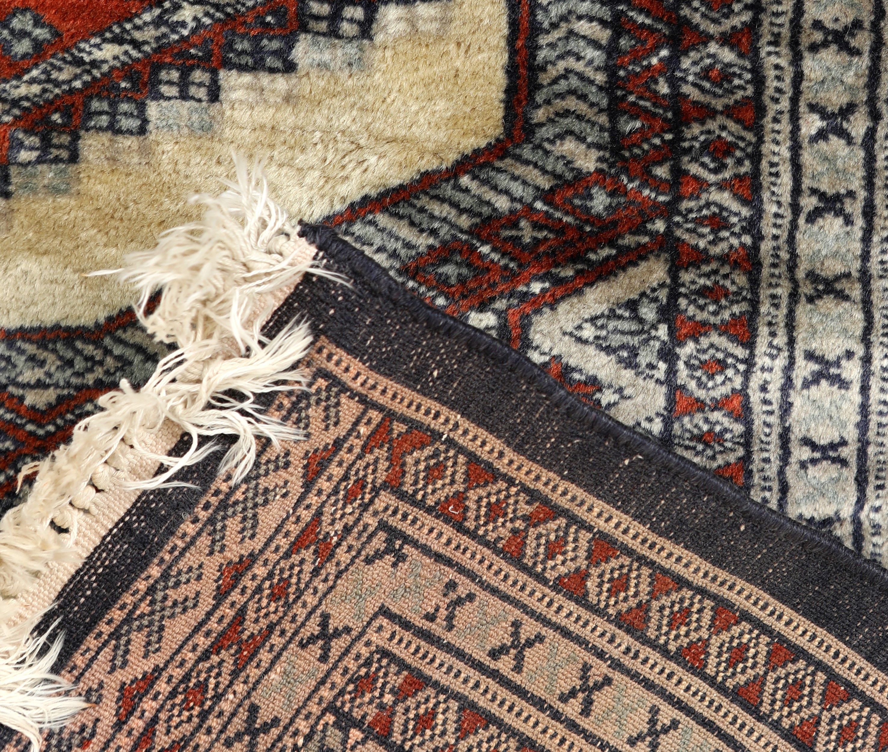 caratterizzato da tre medaglioni principali disposti lungo l’asse longitudinale del tappeto. I medaglioni presentano dettagli geometrici stilizzati, tipici della regione, e sono circondati da motivi secondari, come simboli tribali e piccoli elementi floreali, , mentre la bordura esterna è decorata con motivi angolari ripetuti e simboli a “S”, che rappresentano protezione e continuità nella tradizione del Caucaso.